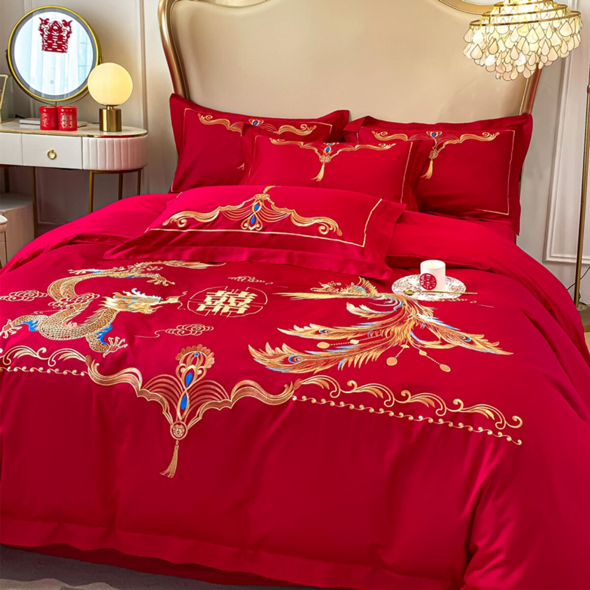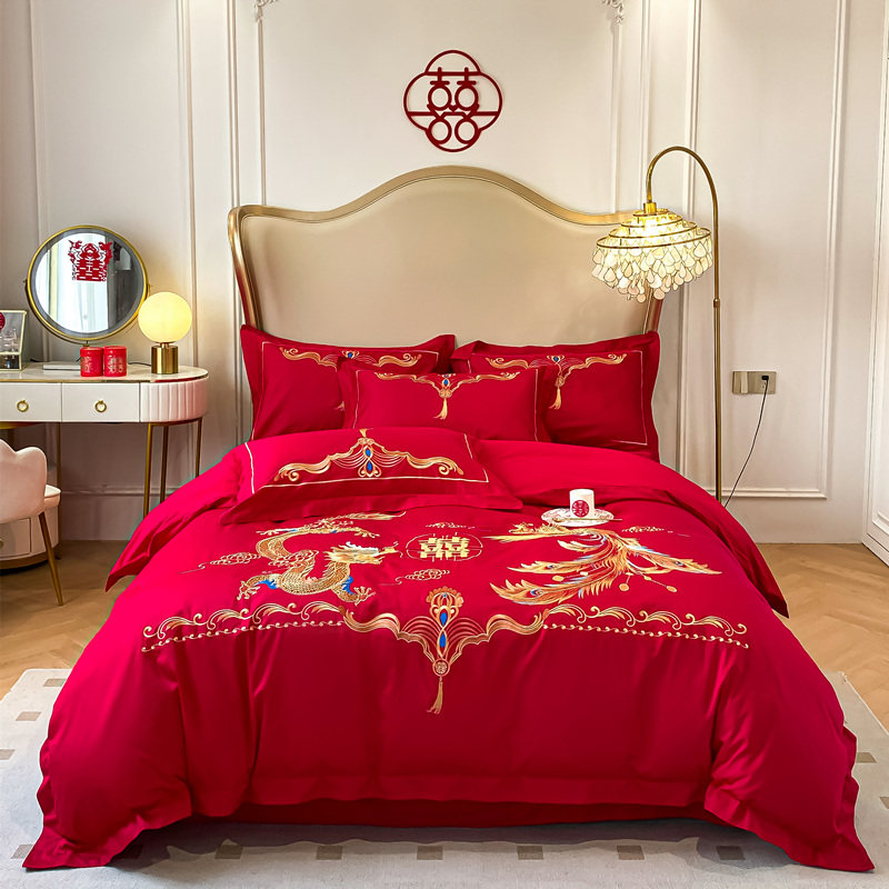 中式龙凤结婚四件套红色床单全棉高级感喜被婚庆床上用品