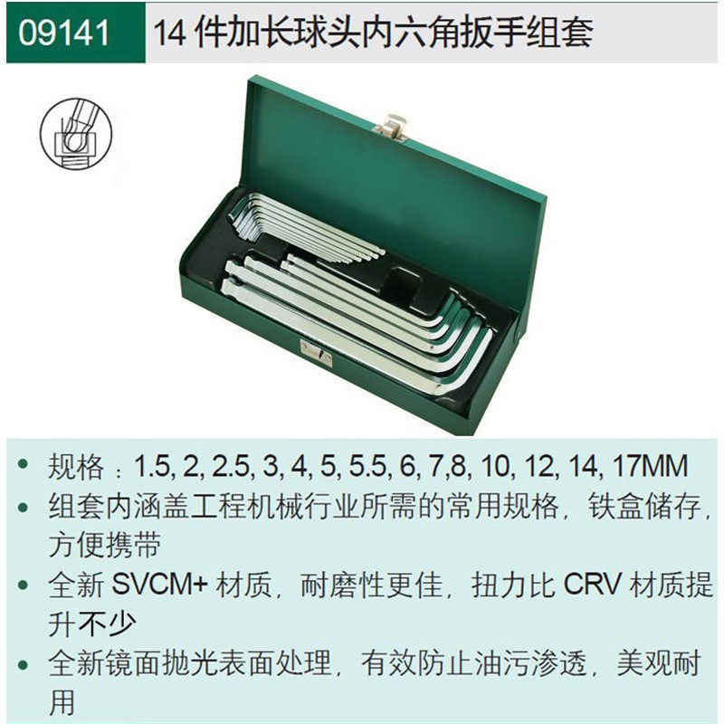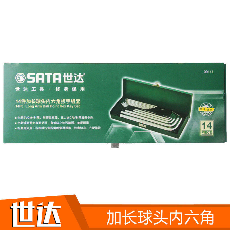 热销sata头 14件加长球世达工具平头内六角扳手组套 09141 09143