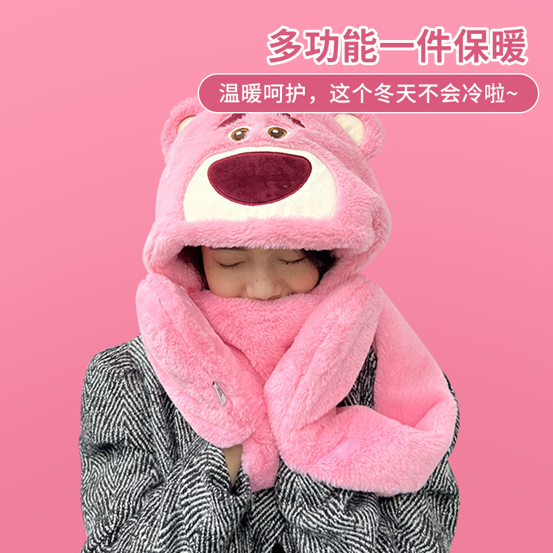 名创优品迪士尼小熊维尼草莓熊三眼仔毛毛三件套围巾帽子手套
