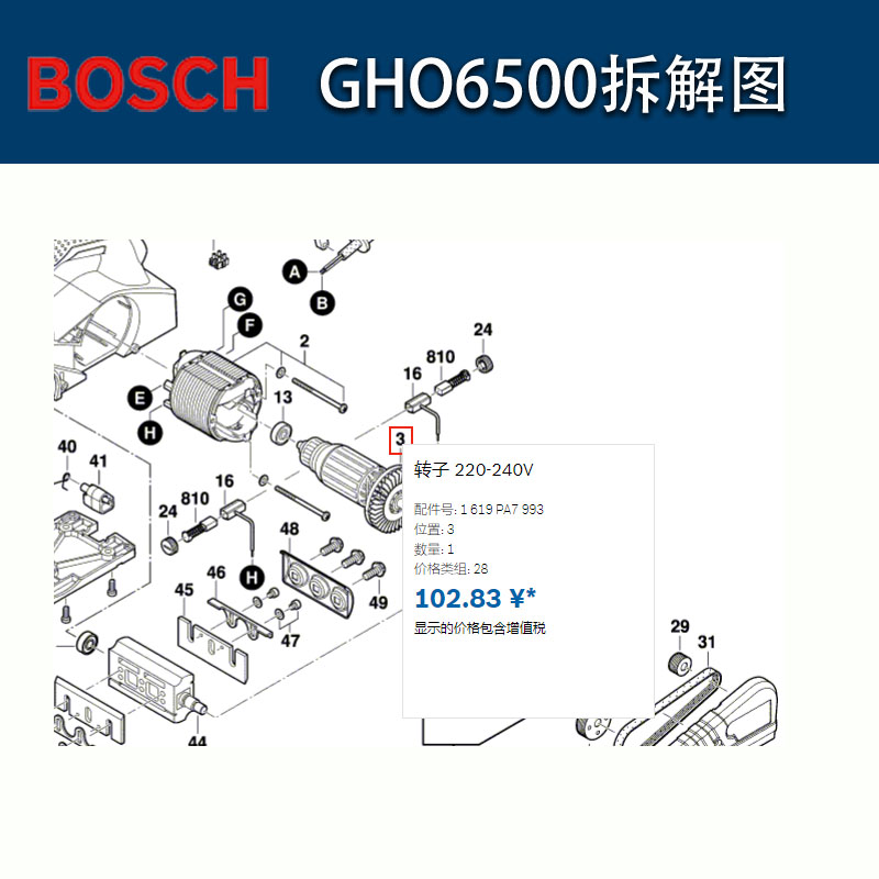 开票 博世电刨手刨刀GHO6500原装转子1619PA7993配件正品刨子订货
