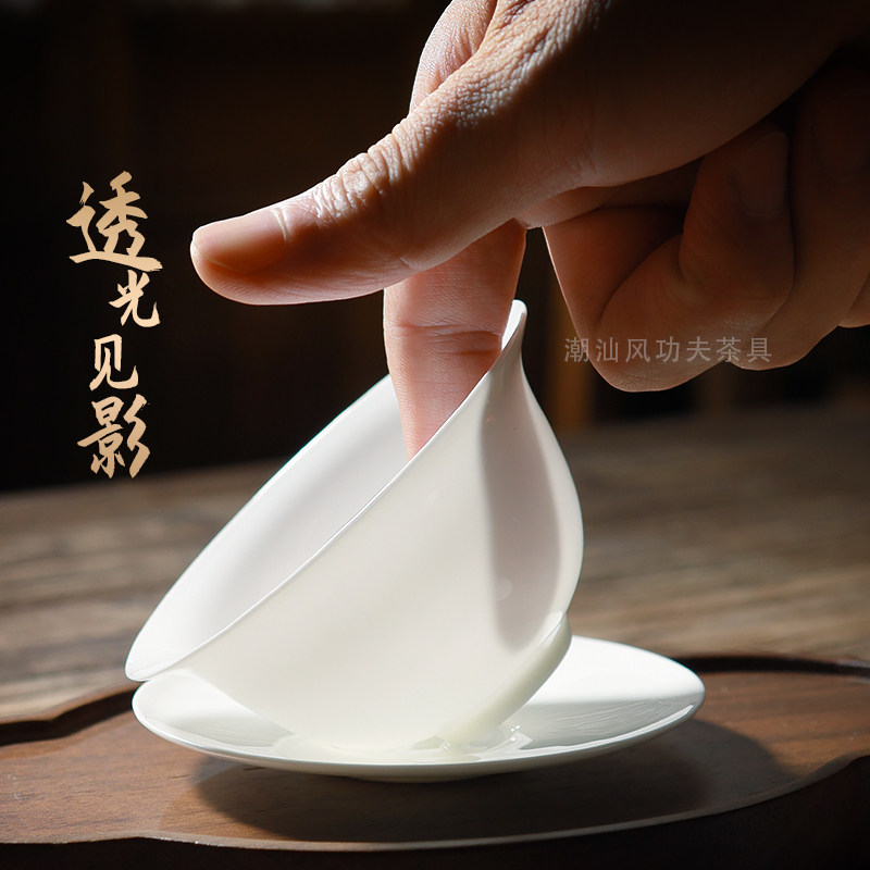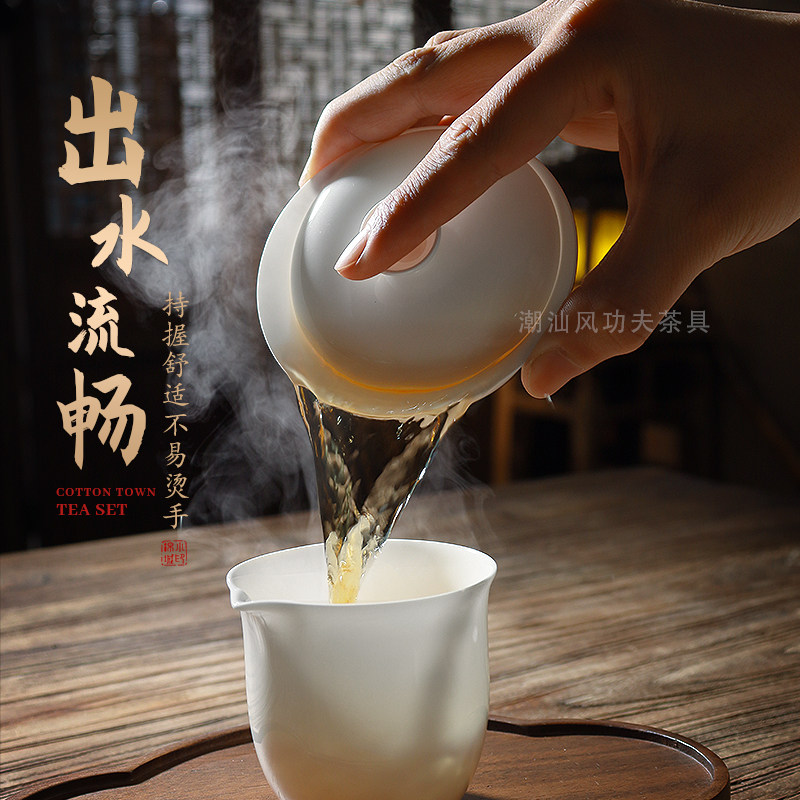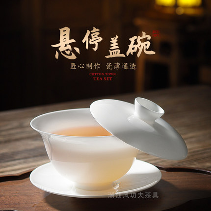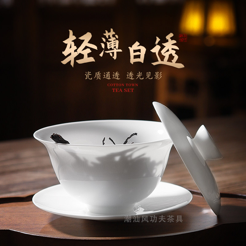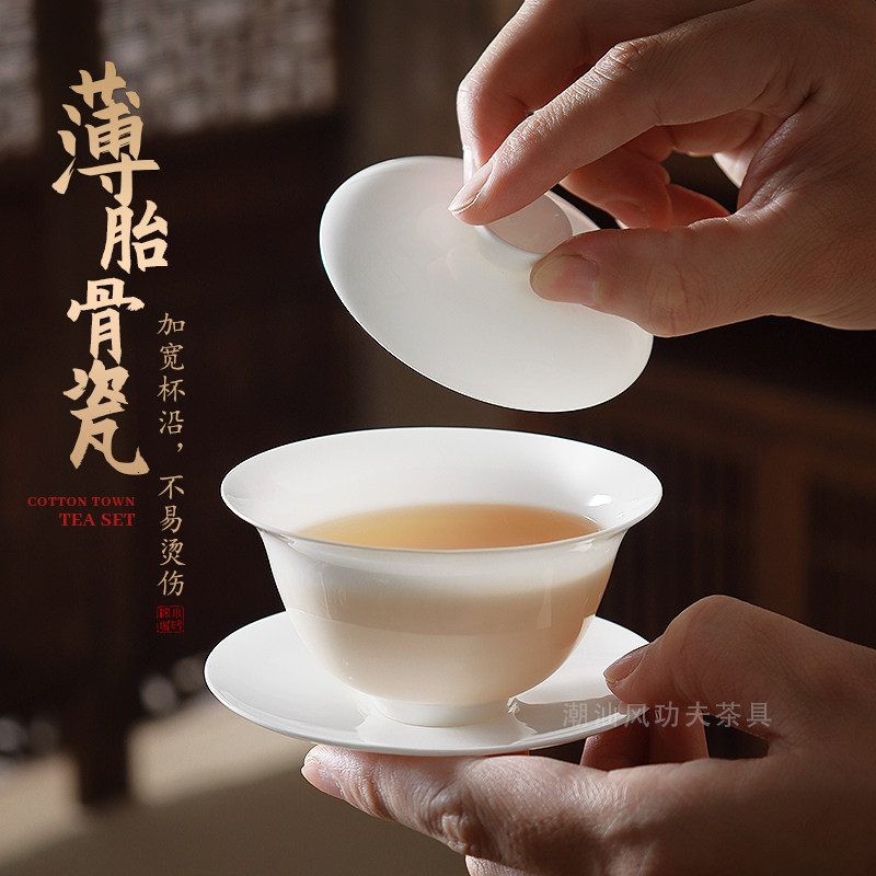 潮州薄胎大撇口不烫手盖碗三才白瓷泡茶功夫茶杯家用高档茶具套装