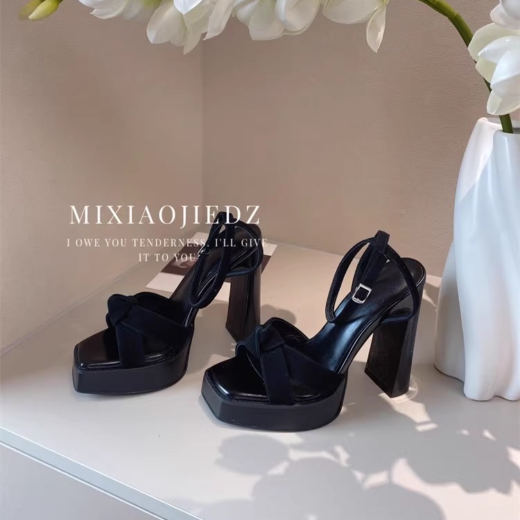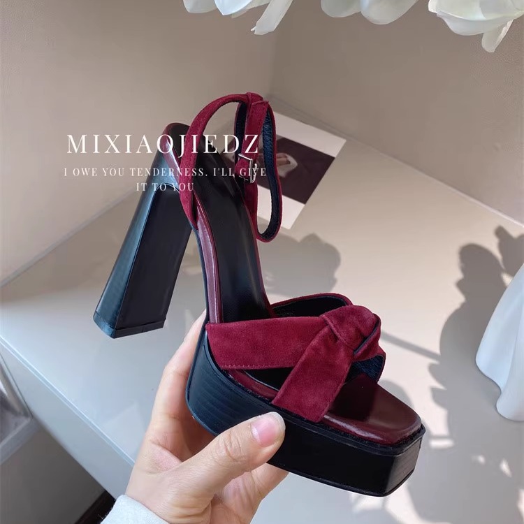 2025新款一字带凉鞋女粗跟高跟鞋女方头防水台气质酒红色真皮凉鞋