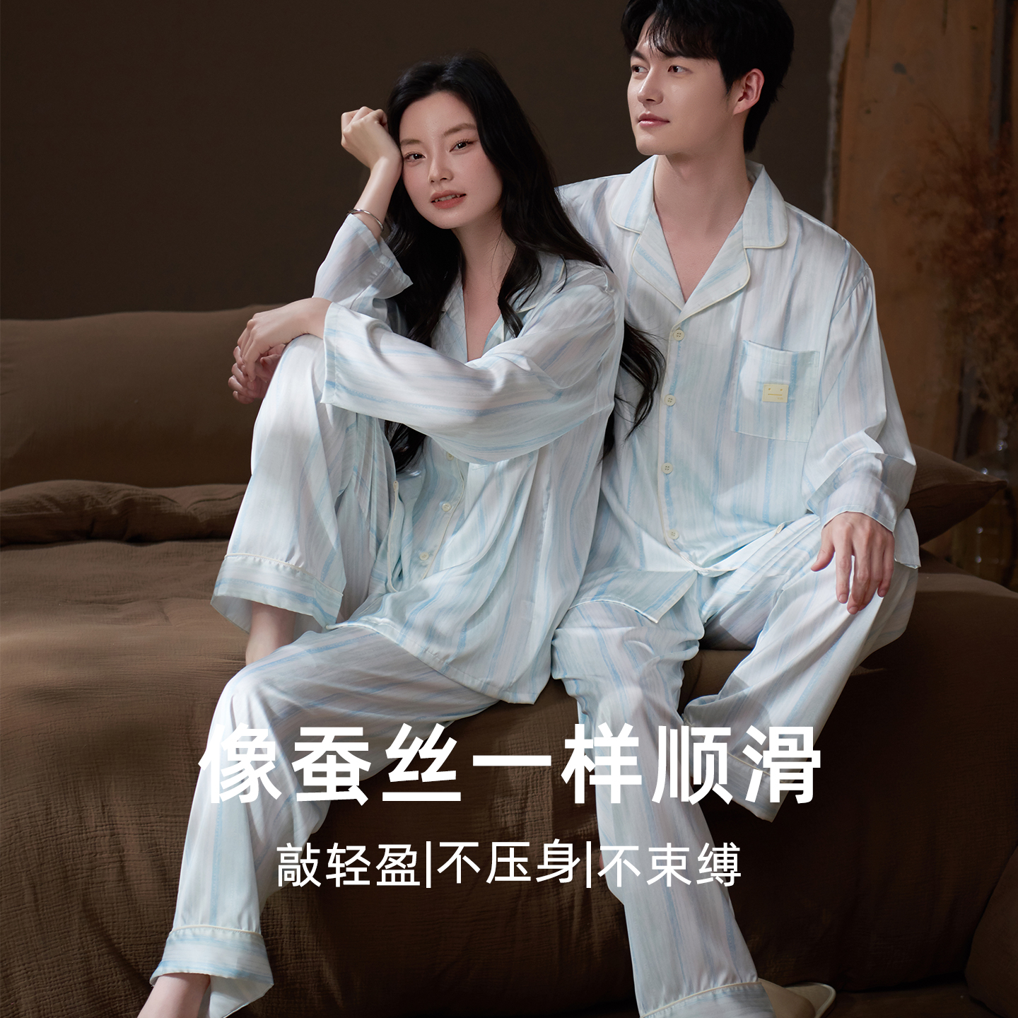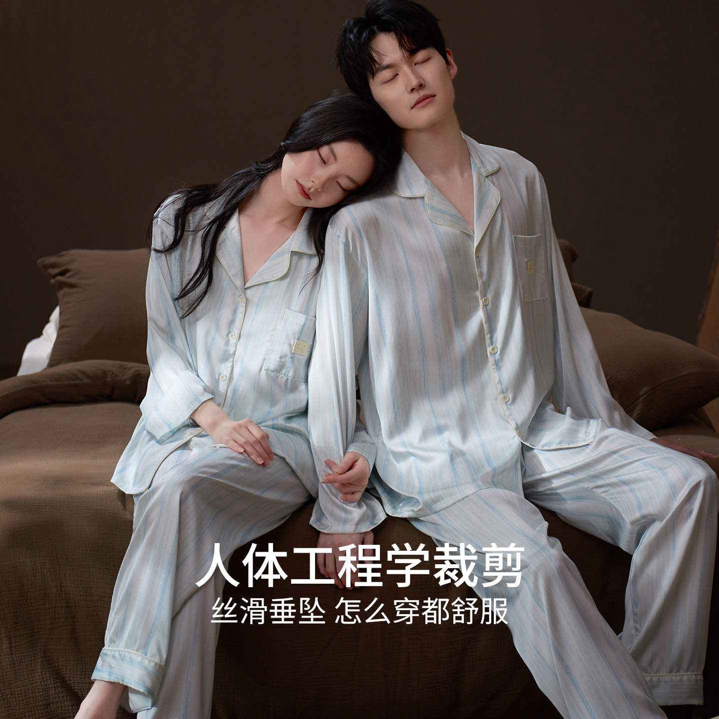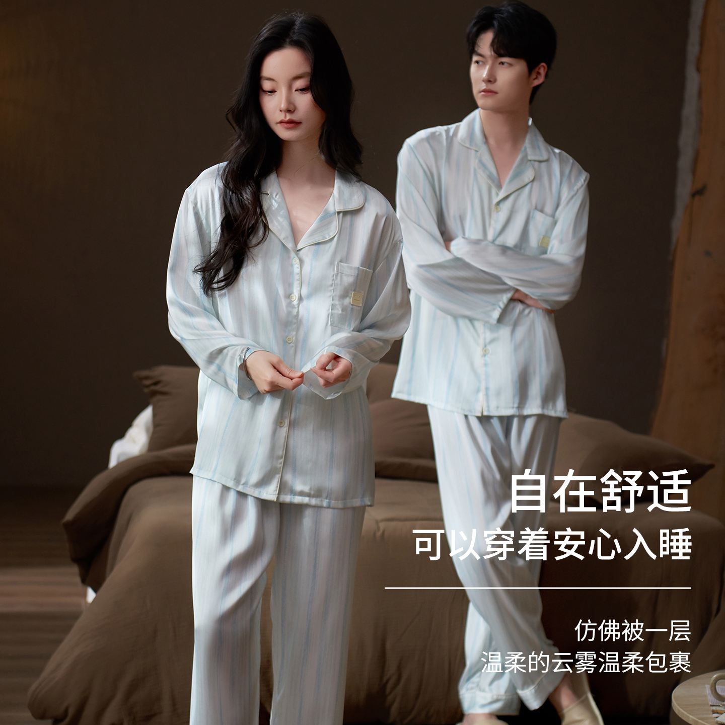 乐姿梦情侣睡衣春秋季冰丝女款春夏天长袖长裤男士条纹家居服套装