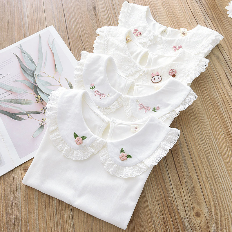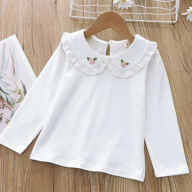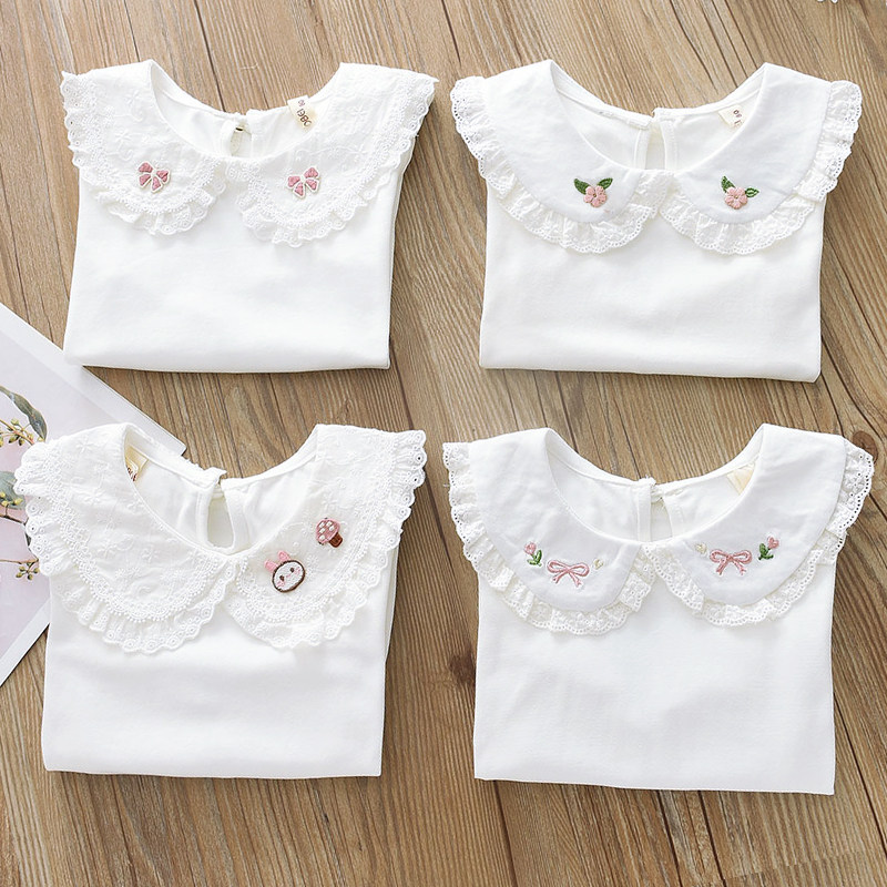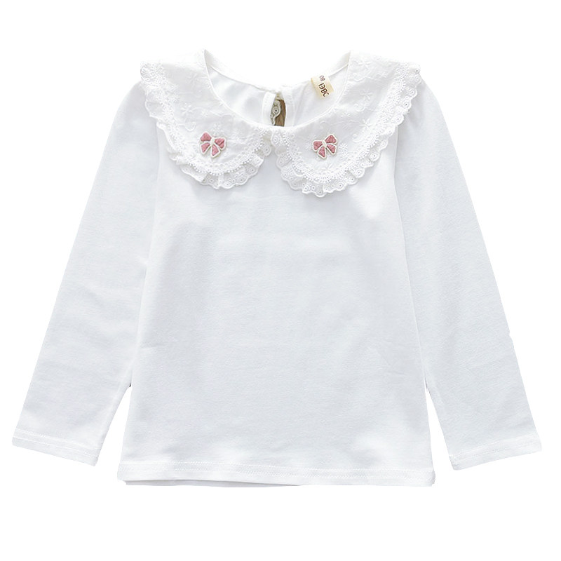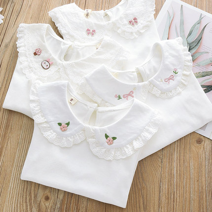 洋气女童纯棉圆领打底衫儿童大翻领花边长袖T恤衫中大童白色衬衣