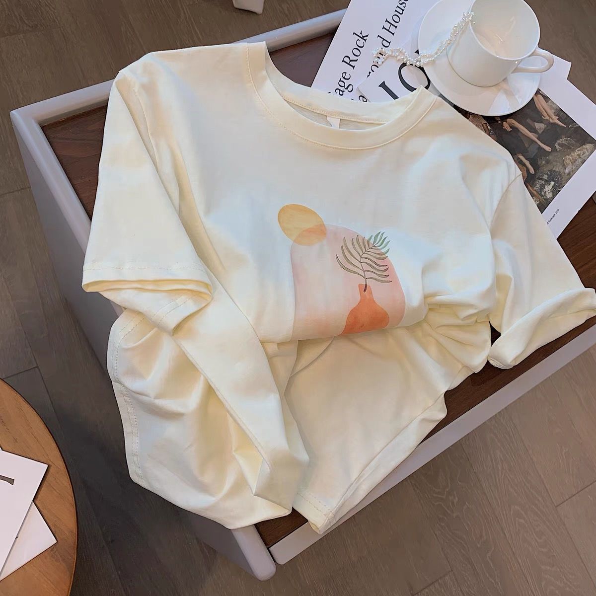 杏色油画印花莫代尔短袖t恤女2025夏季新款韩版宽松简约半袖体恤