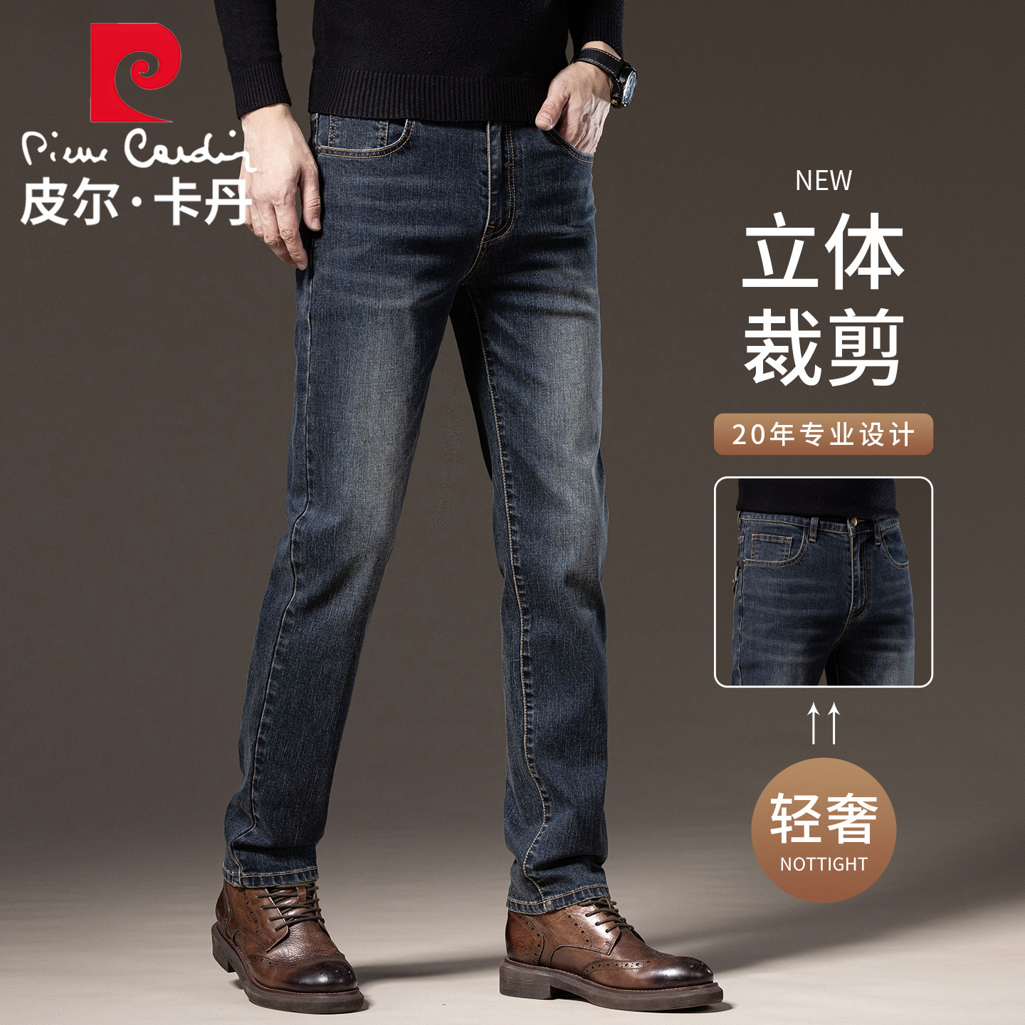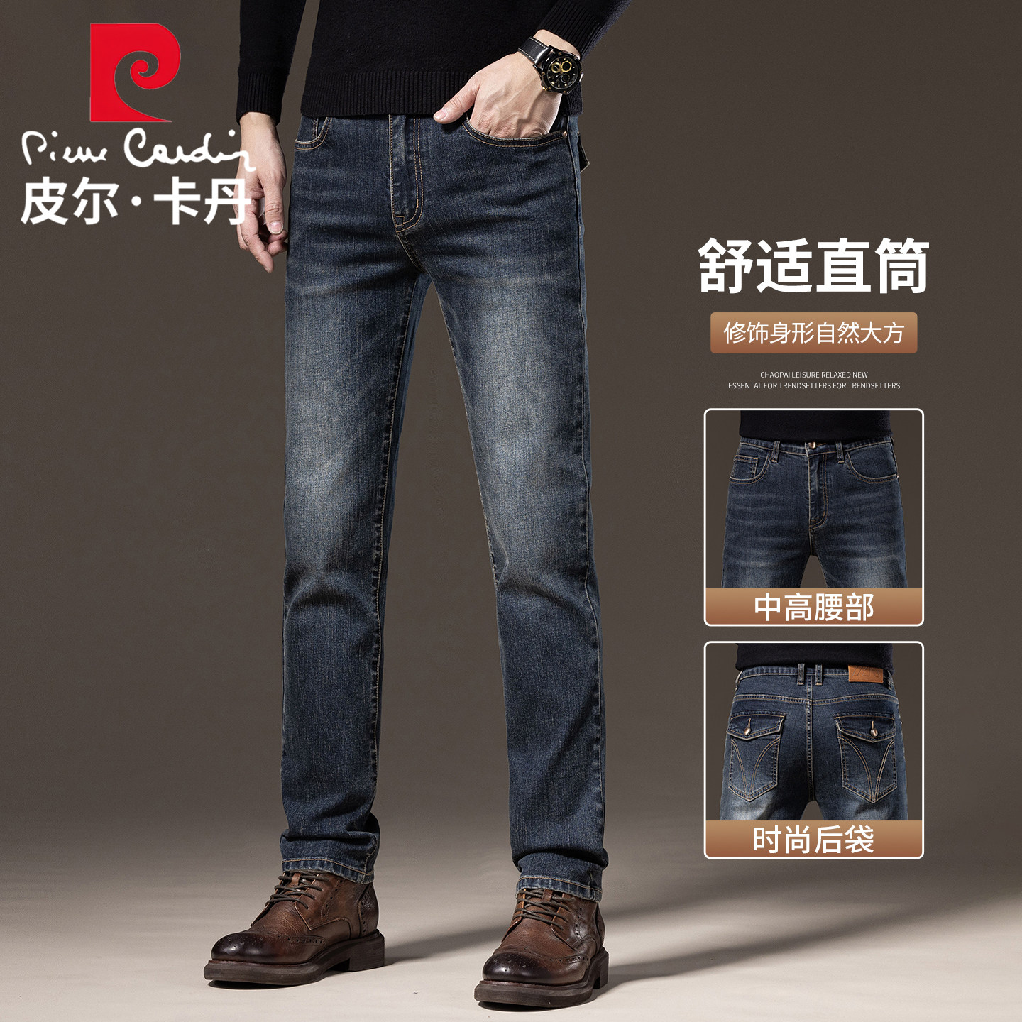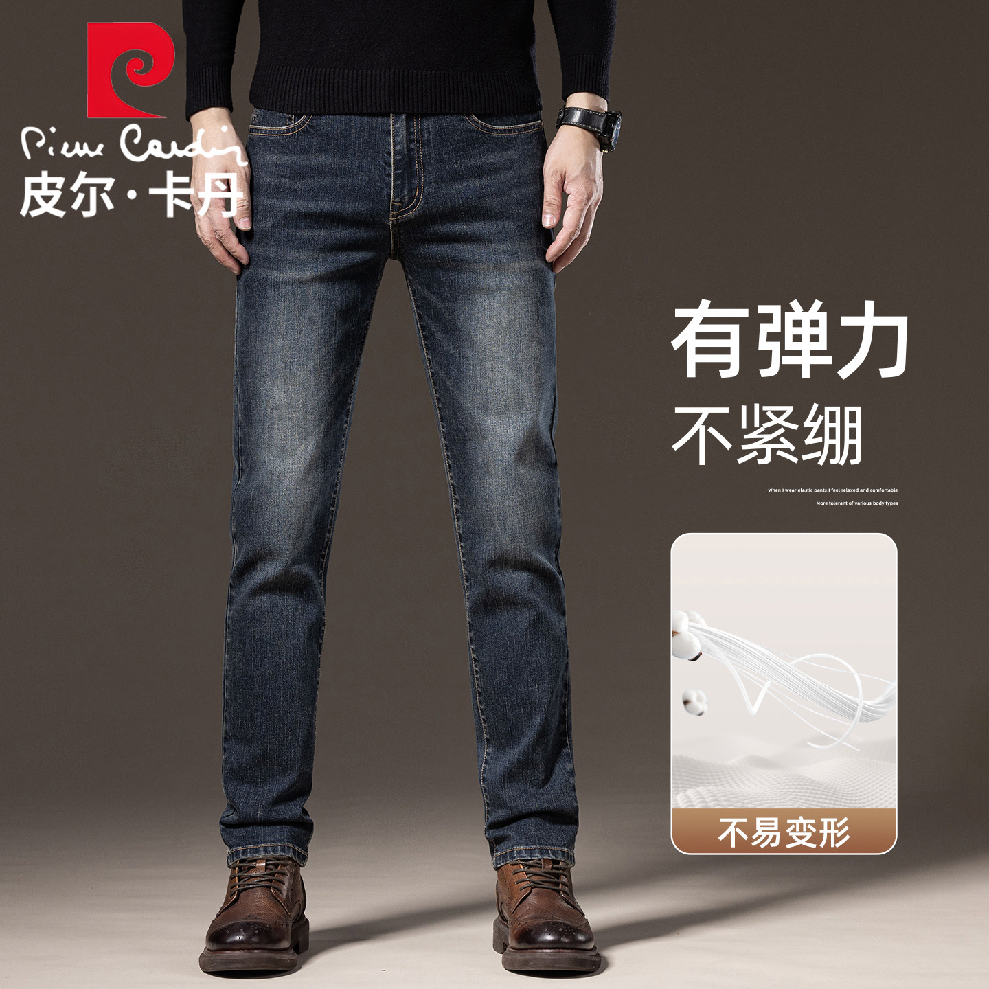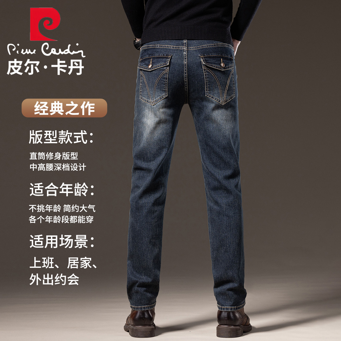 皮尔卡丹深蓝色高端牛仔裤男秋冬季修身直筒2025新款弹力加绒长裤