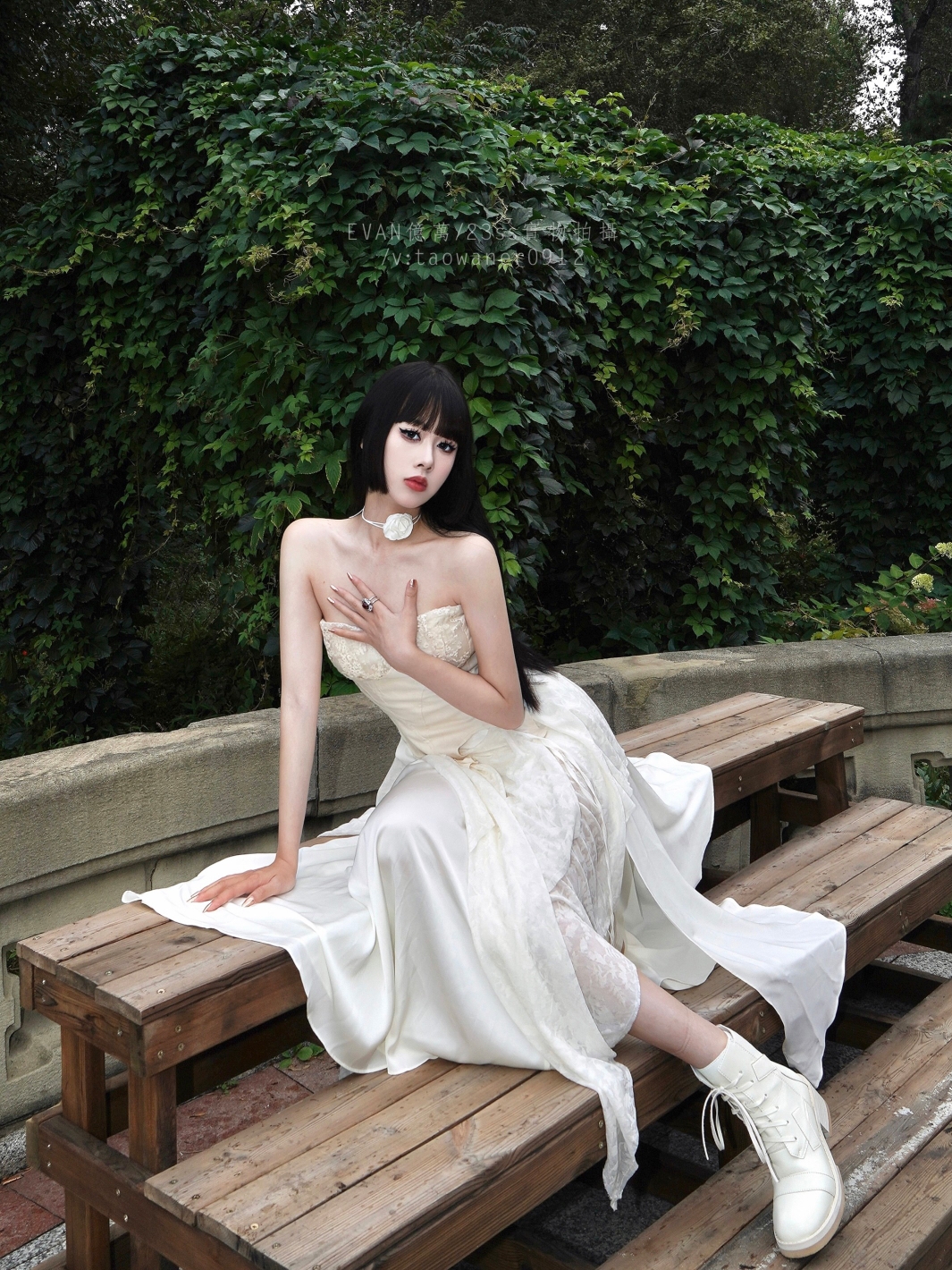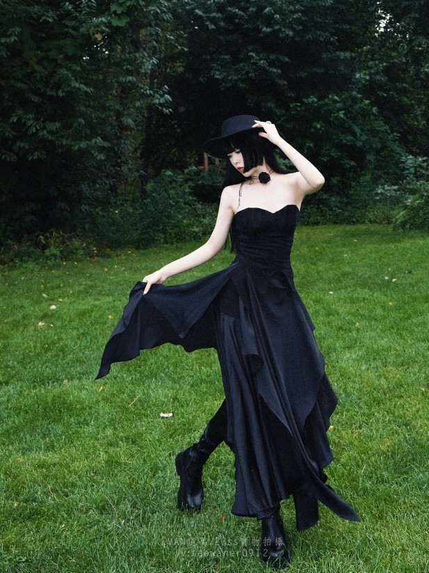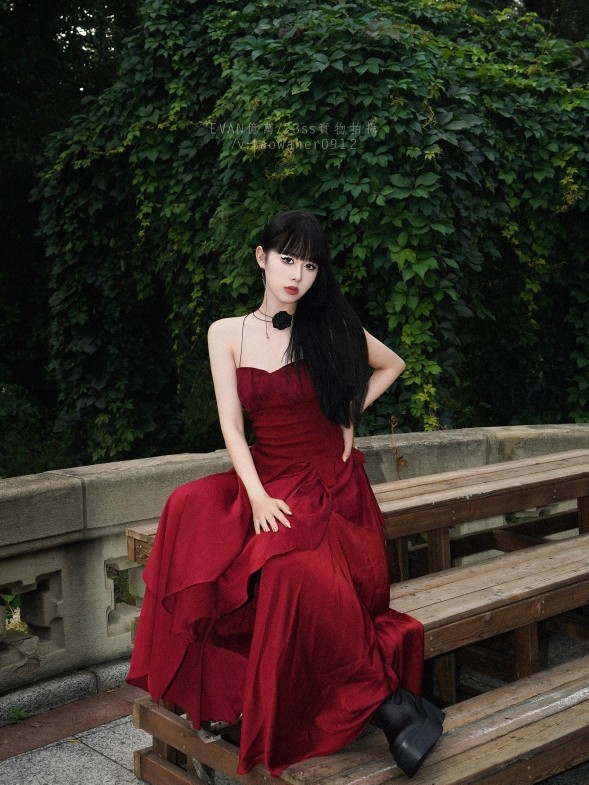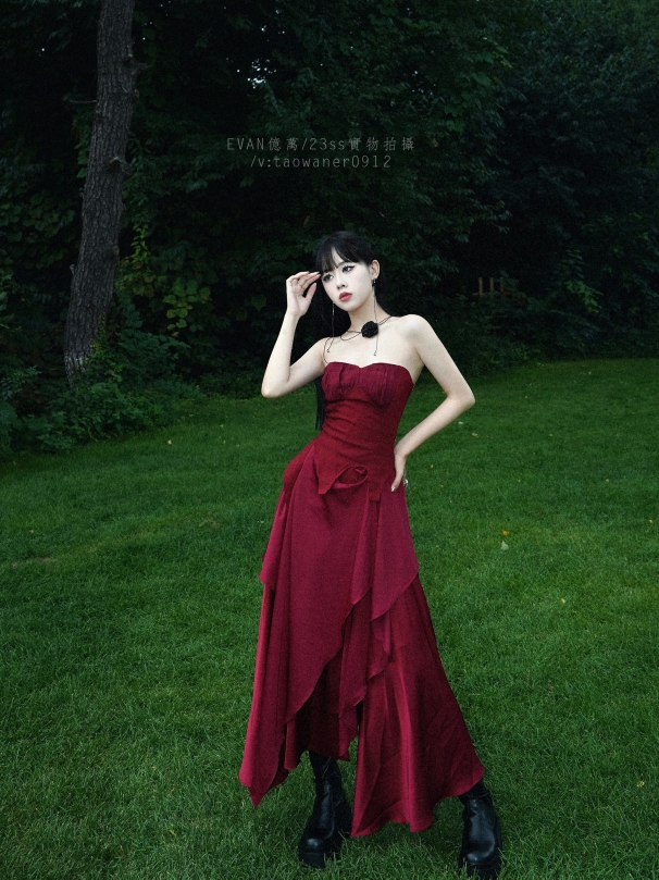 EVAN/暗黑设计感亚麻酒红色裙子鱼骨抹胸不规则半裙收腰套装elywo