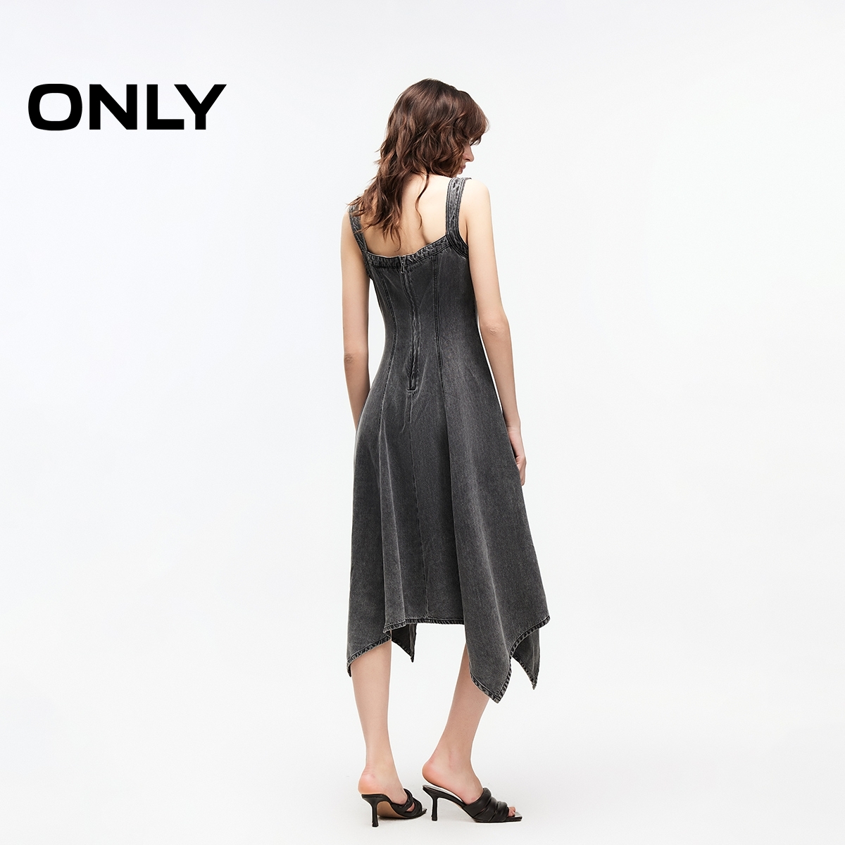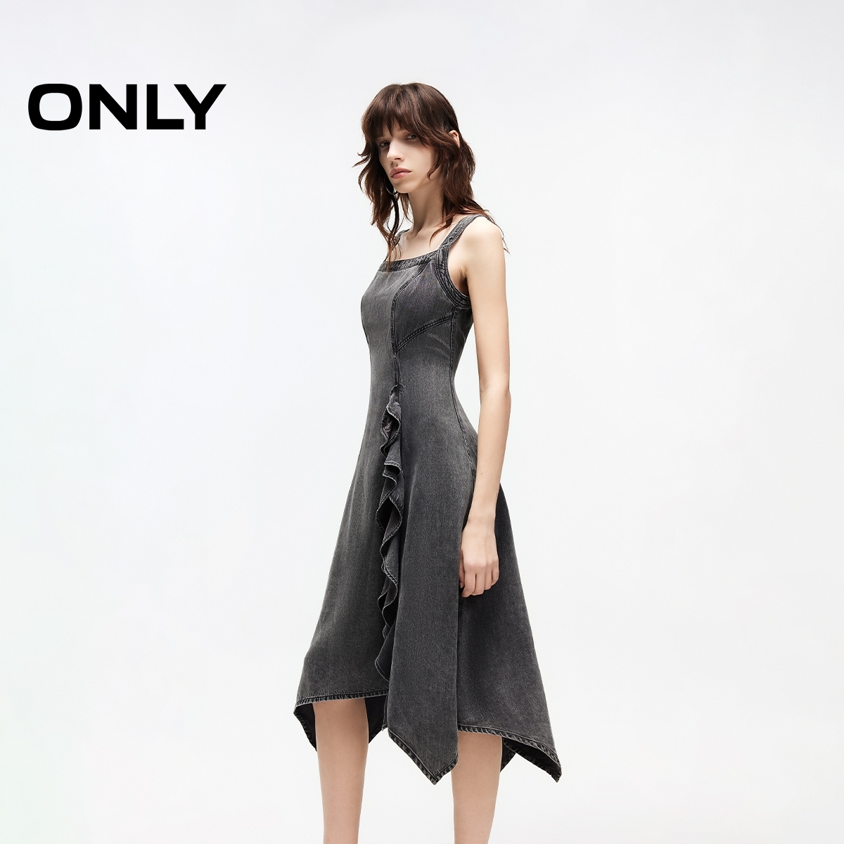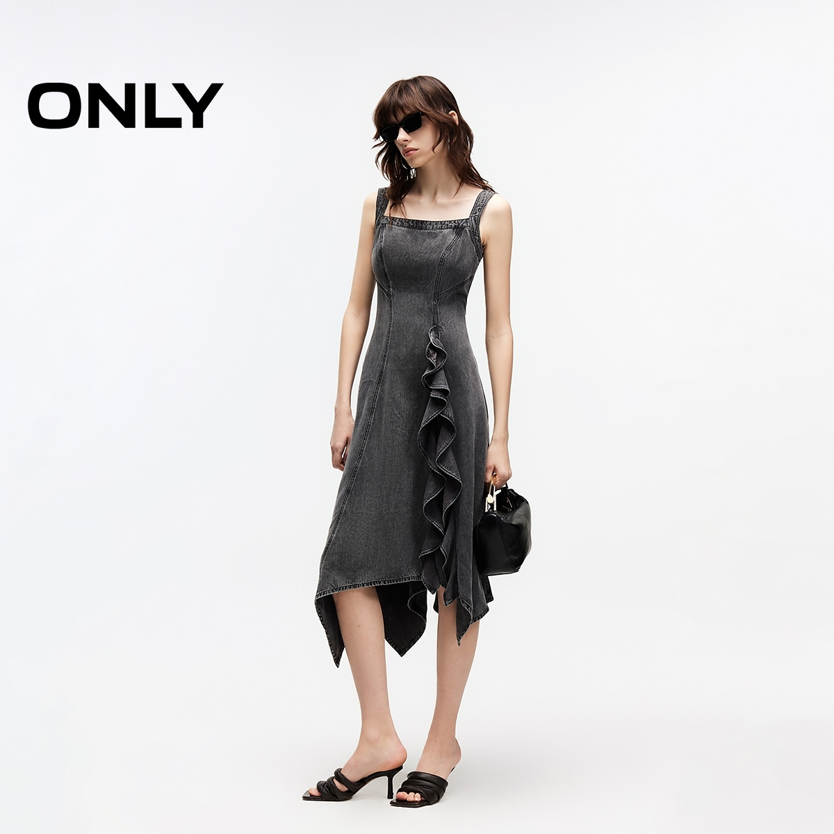 ONLY2025秋季新款单侧时髦立体褶饰方领吊带中长裙牛仔连衣裙女