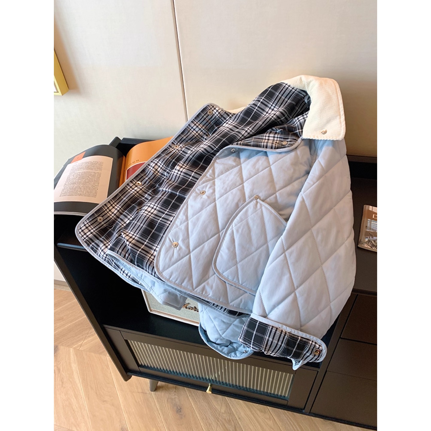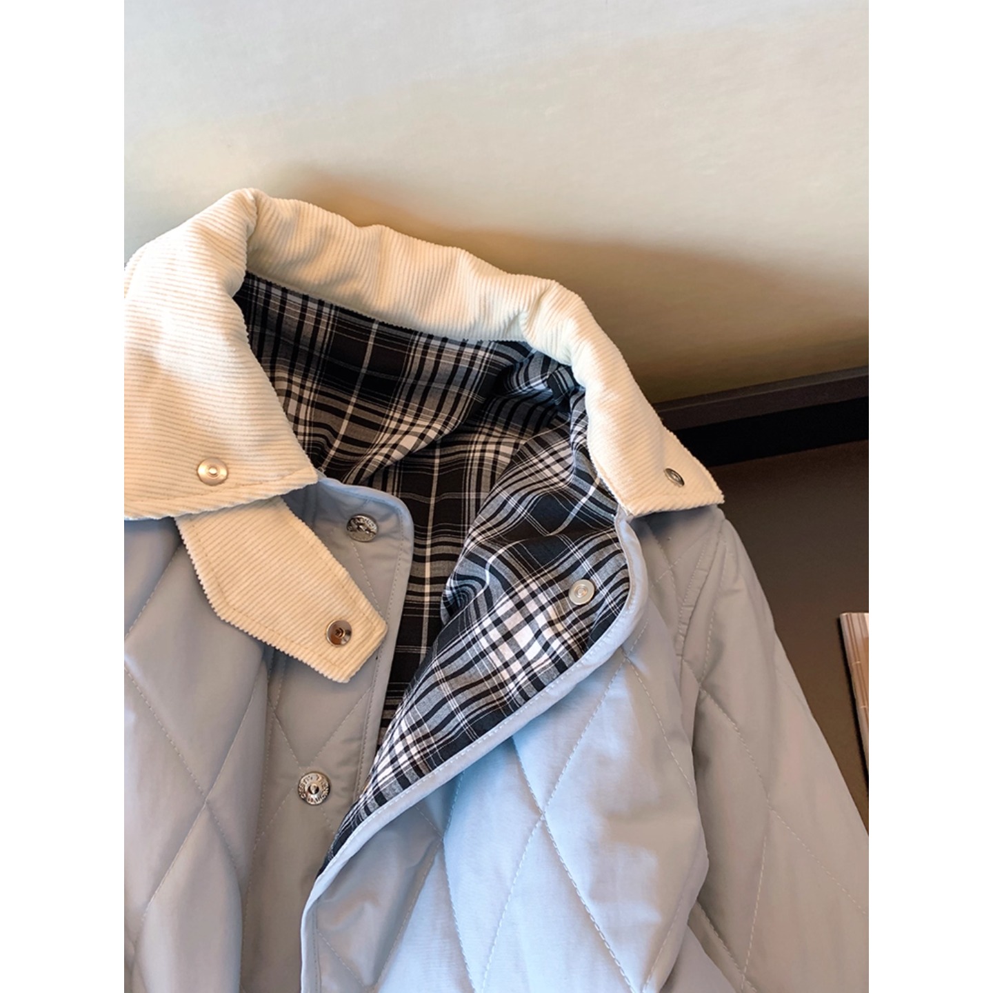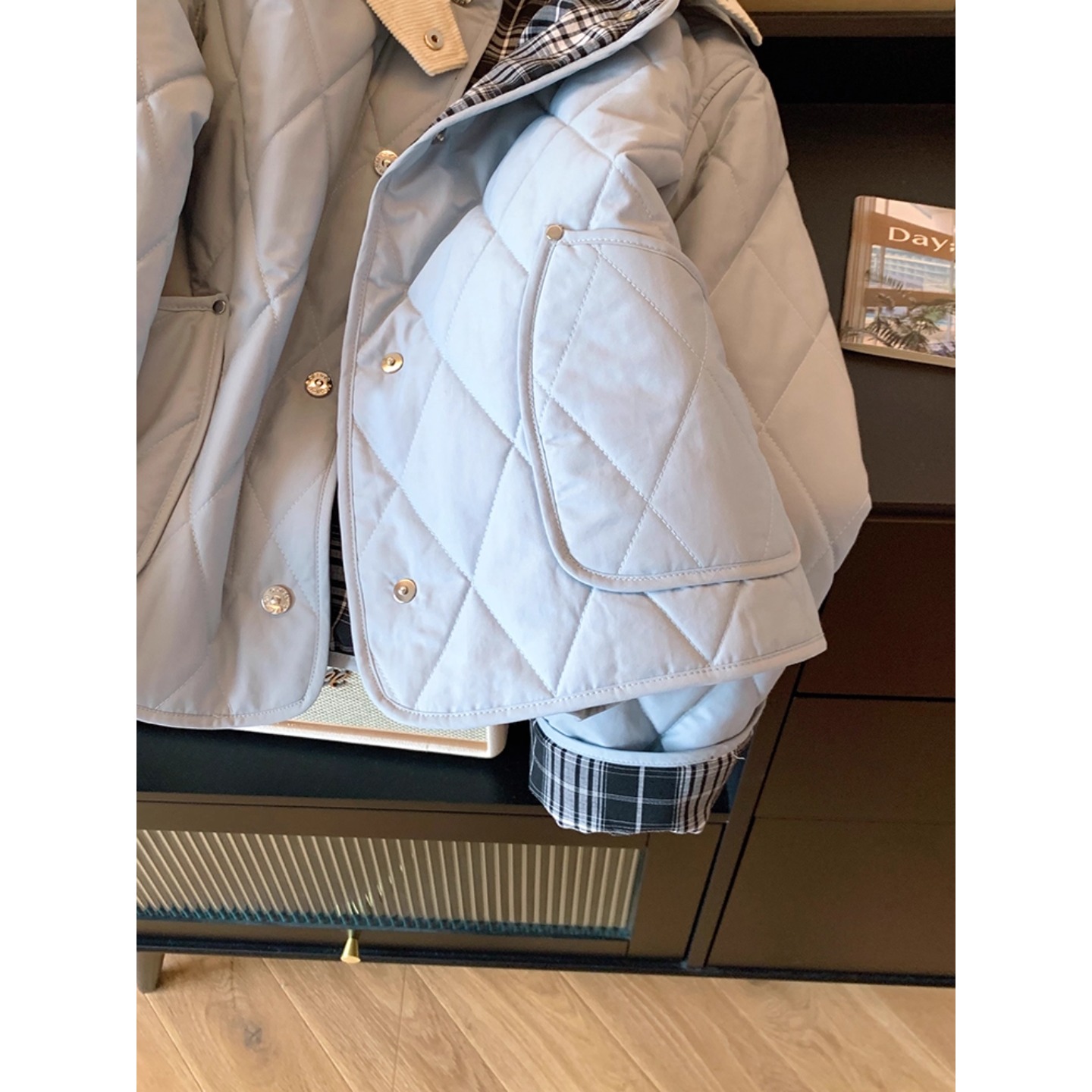 baby蓝格纹拼接灯芯绒翻领羽绒棉服女秋冬款韩版休闲保暖棉衣外套