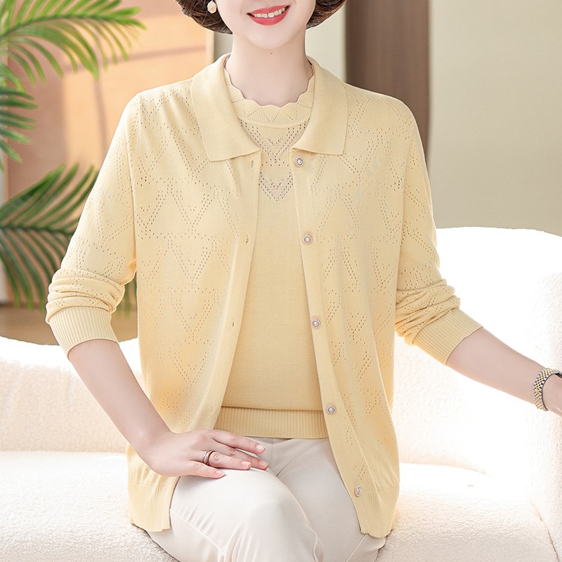 初春薄款上衣中老年人两件套妈妈春夏季新款针织翻领套装开衫女装
