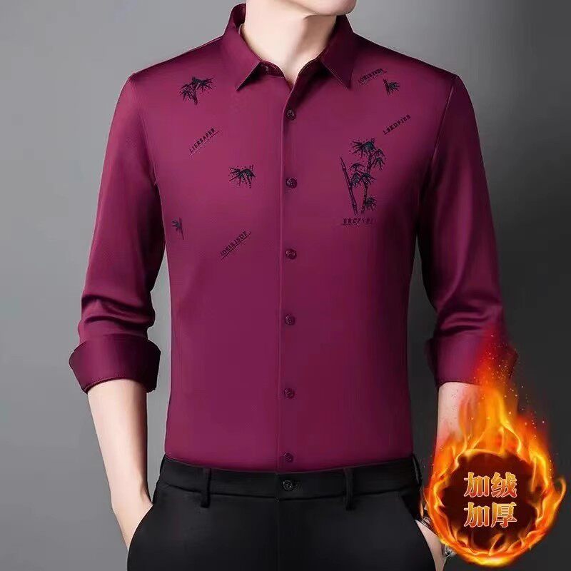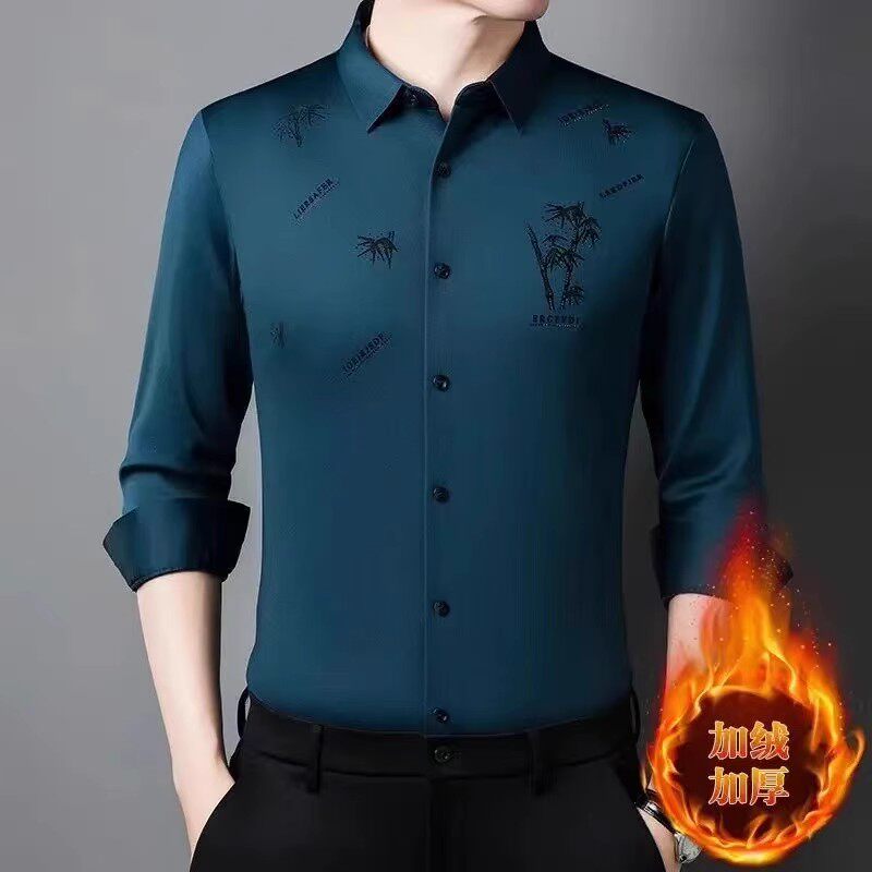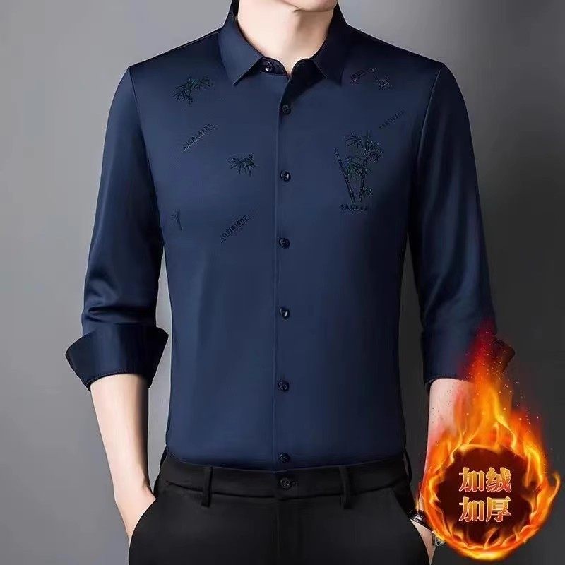 皮尔卡丹高档桑蚕丝男士长袖衬衫秋冬季加绒加厚保暖中年男装衬衣
