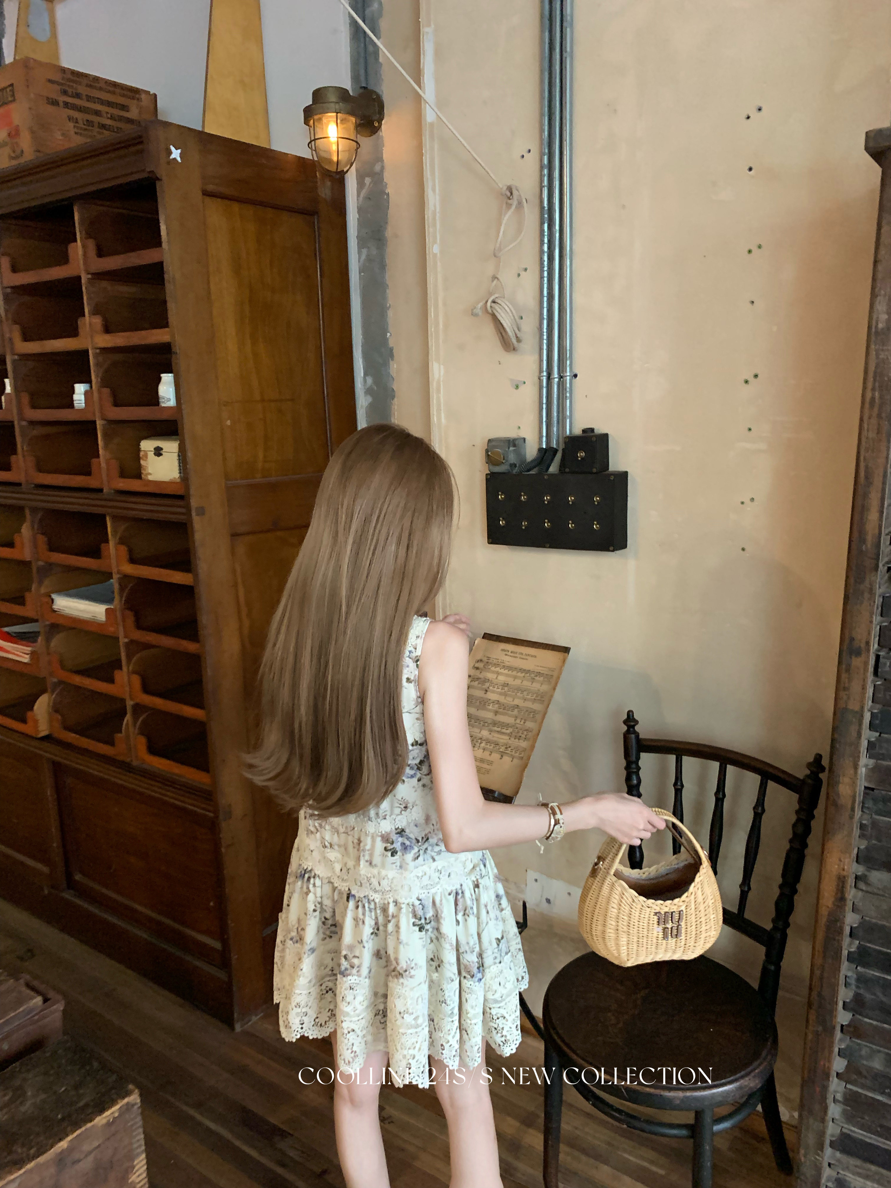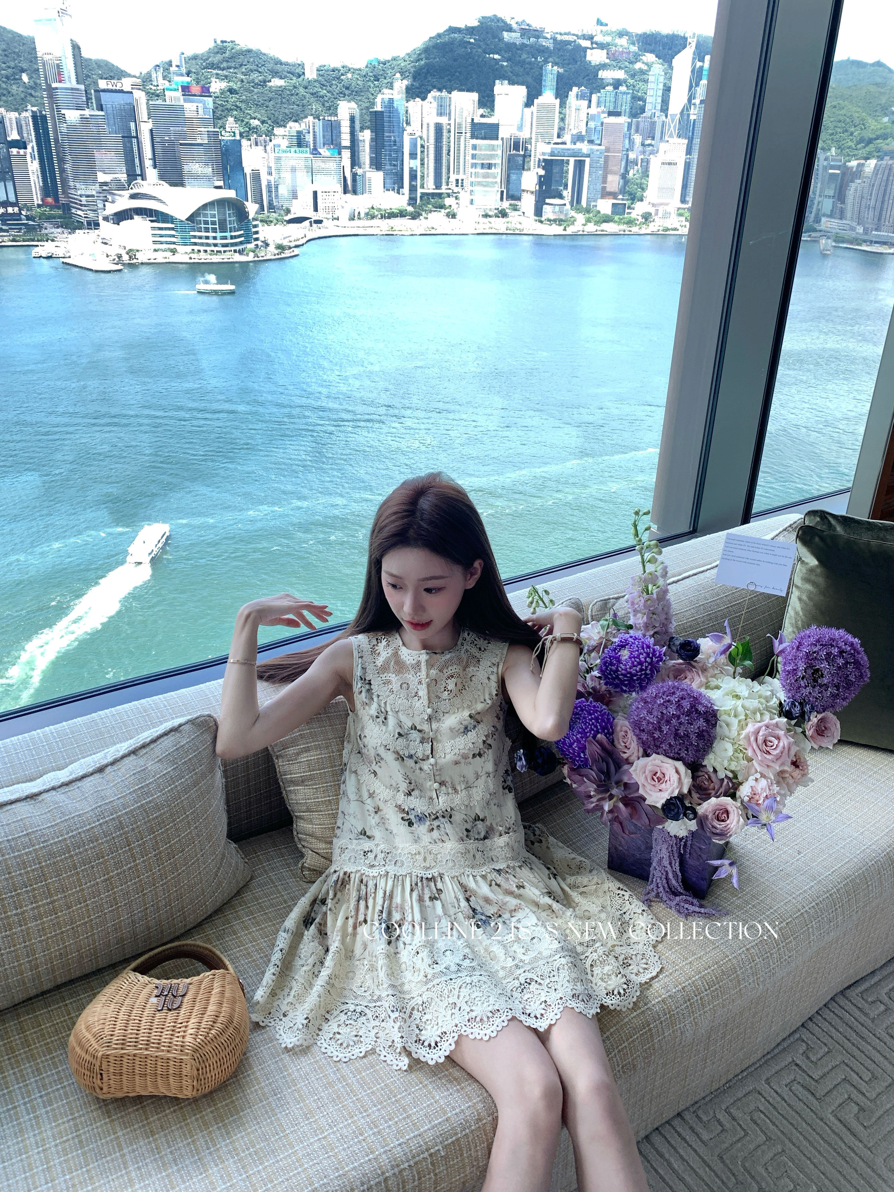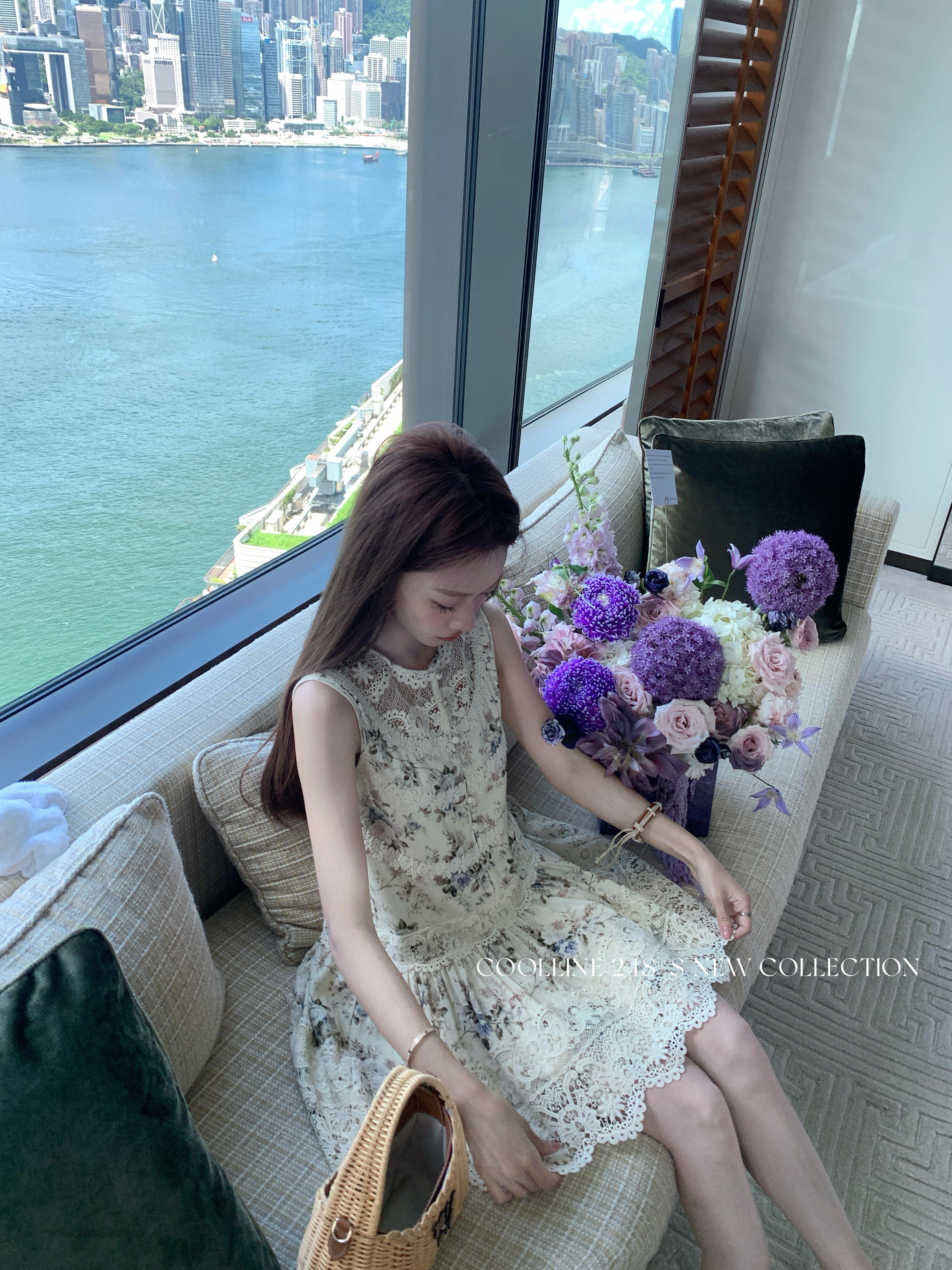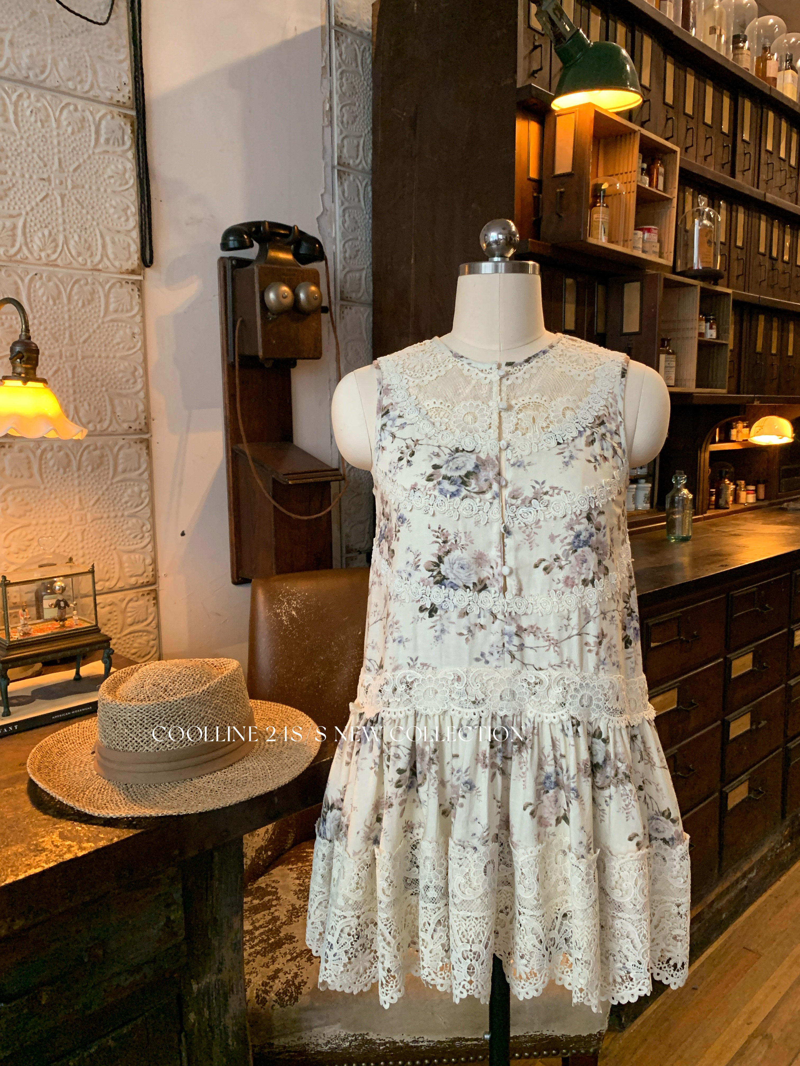 COOLLINE林子熙 夏末繁花 重工蕾丝拼接无袖连衣裙气质百褶短裙女
