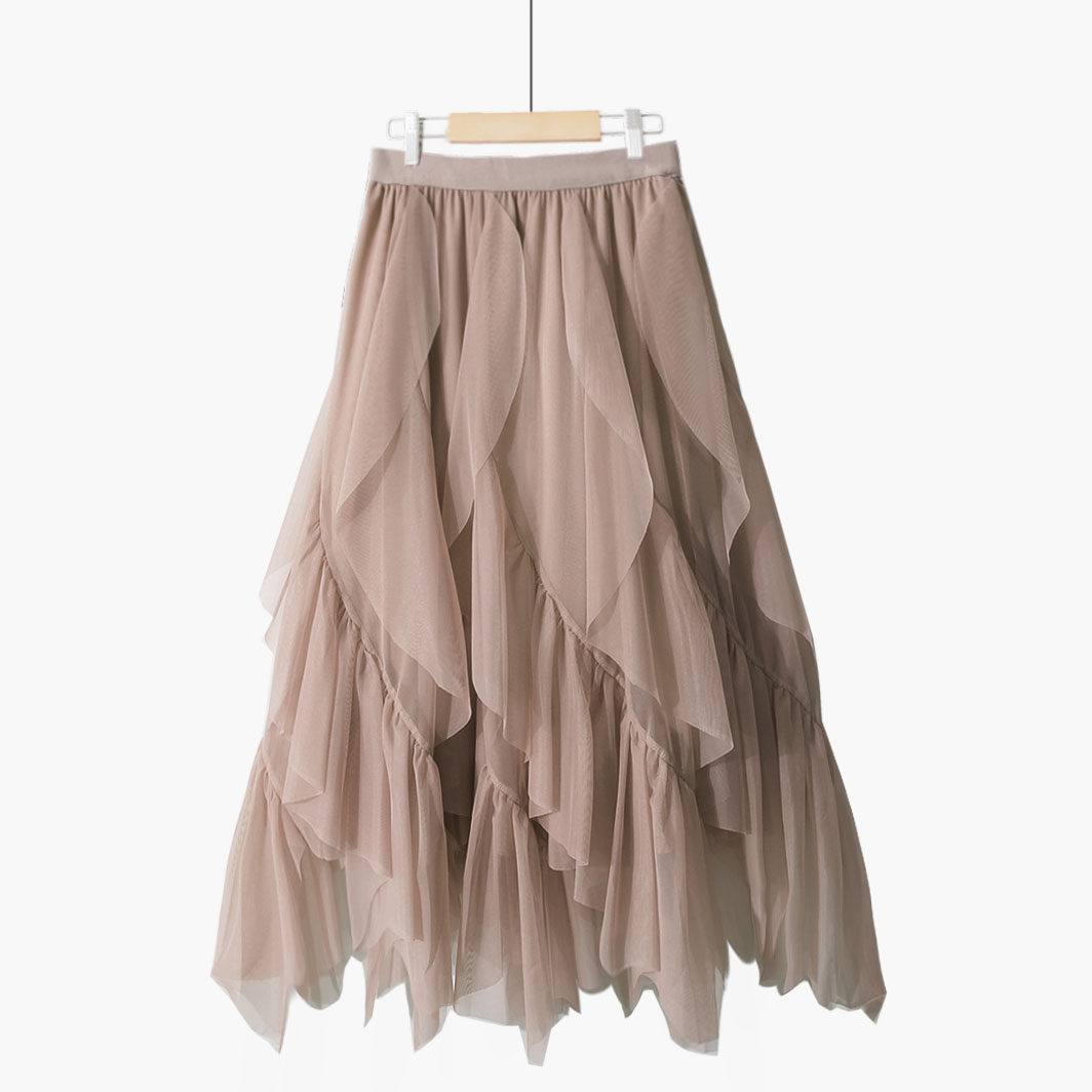 秋冬新款洋气法式设计感网纱高腰韩版荷叶边不规则拼接纯色半身裙