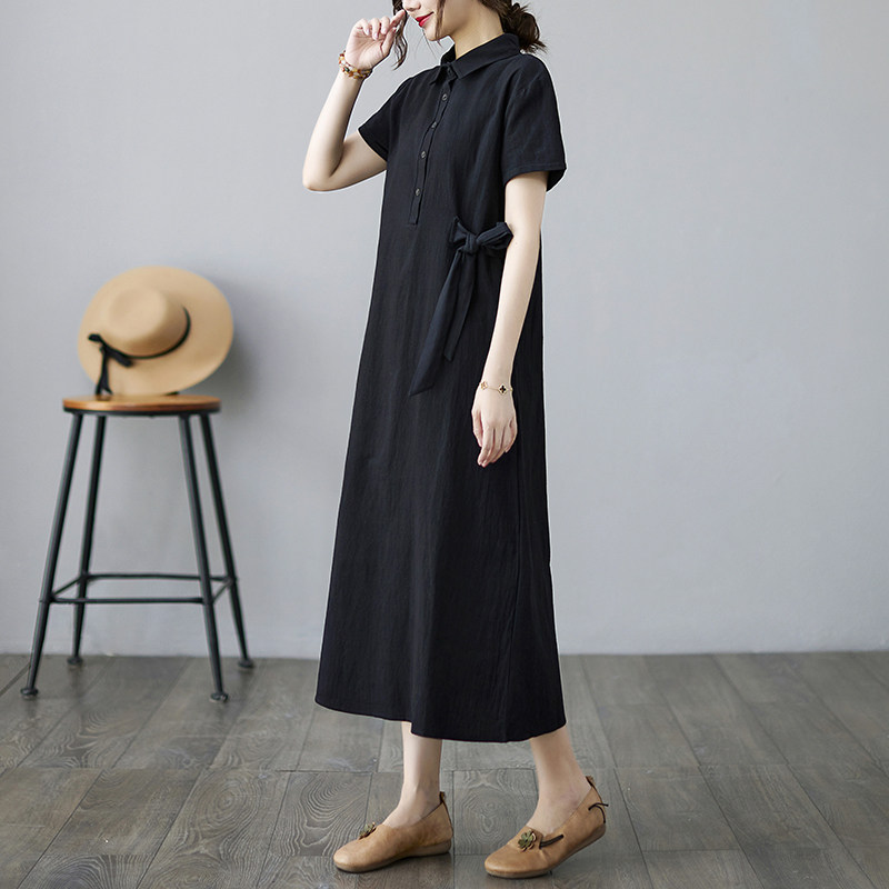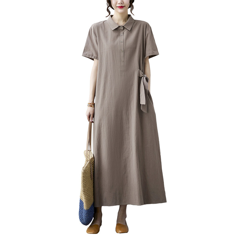 胖mm纯色棉麻大码连衣裙女2024新款夏气质收腰显瘦长款过膝衬衫裙