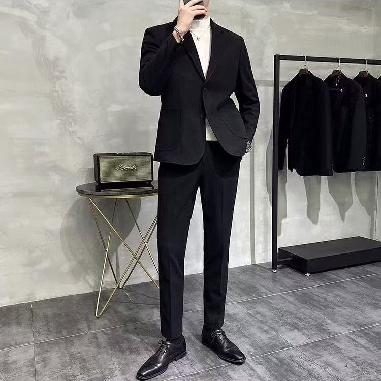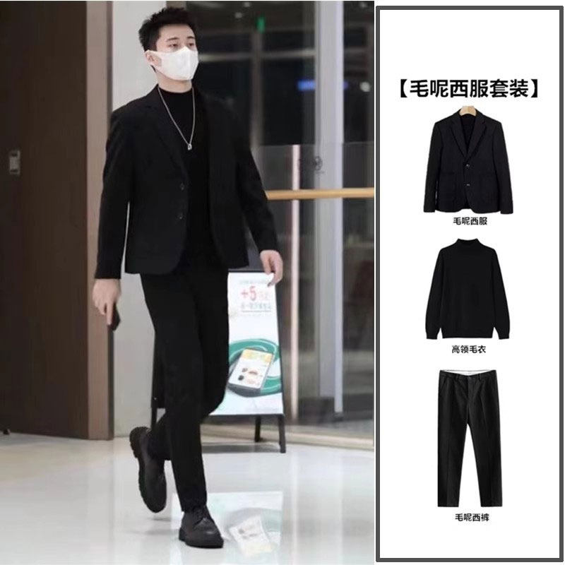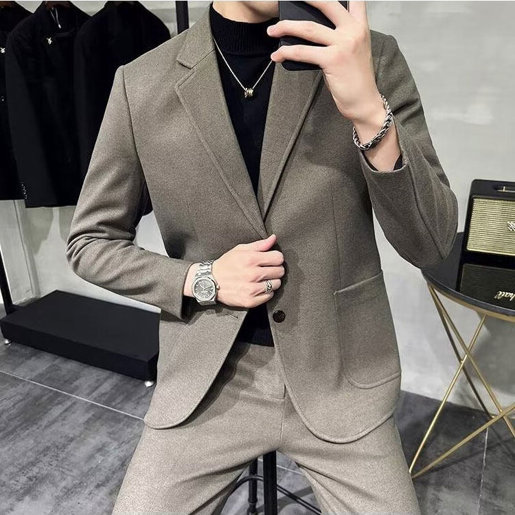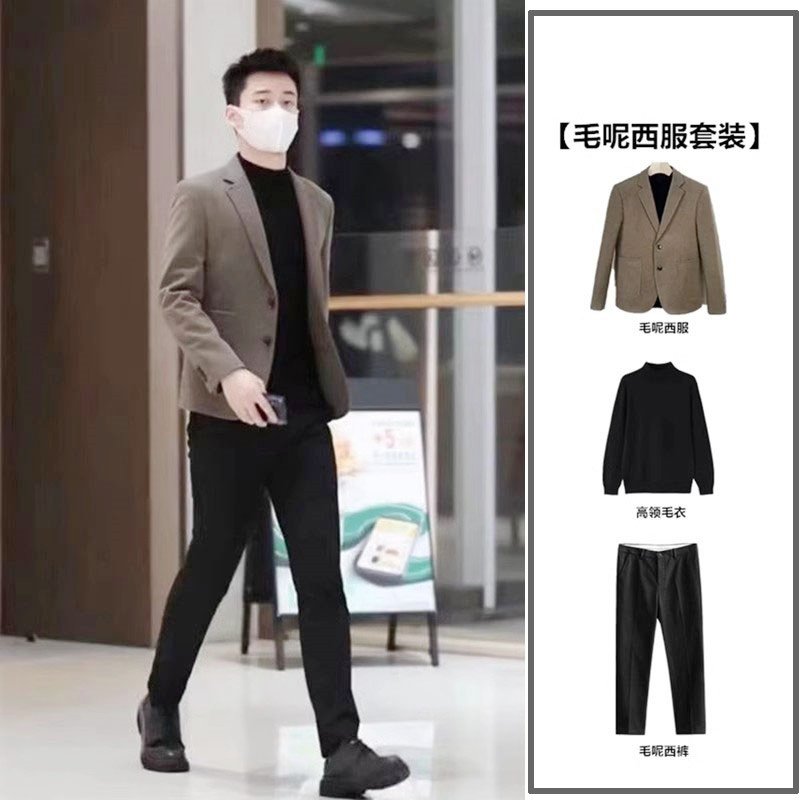 秋冬季加厚毛呢西服套装男士韩版潮流修身显瘦西装外套搭配一整套