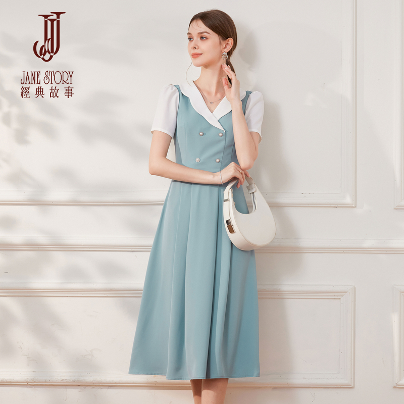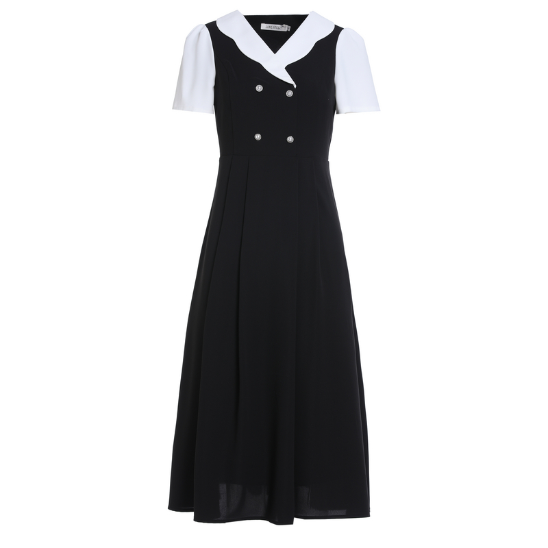法式浪漫西装领雪纺连衣裙女2025新款夏季撞色泡泡袖减龄收腰裙子