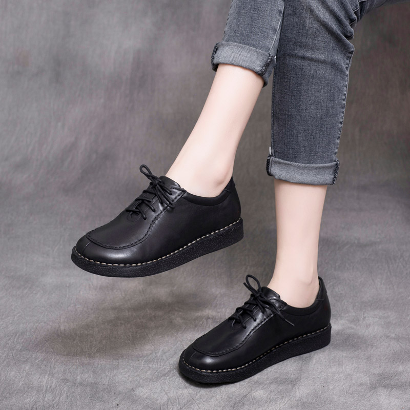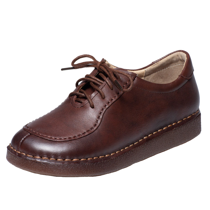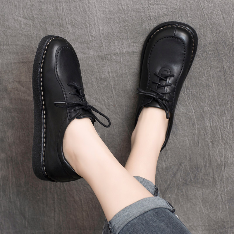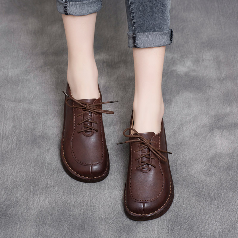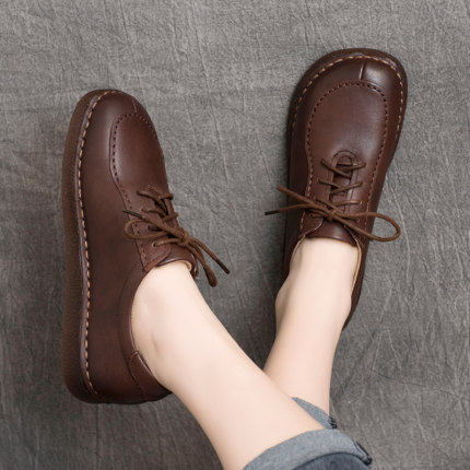 2025年春季新款复古真皮手工女鞋低跟系带软底平底单鞋牛筋底女鞋