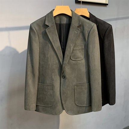 男士休闲麂皮绒西装外套轻奢雅痞单排扣修身西服潮流纯色单西外套