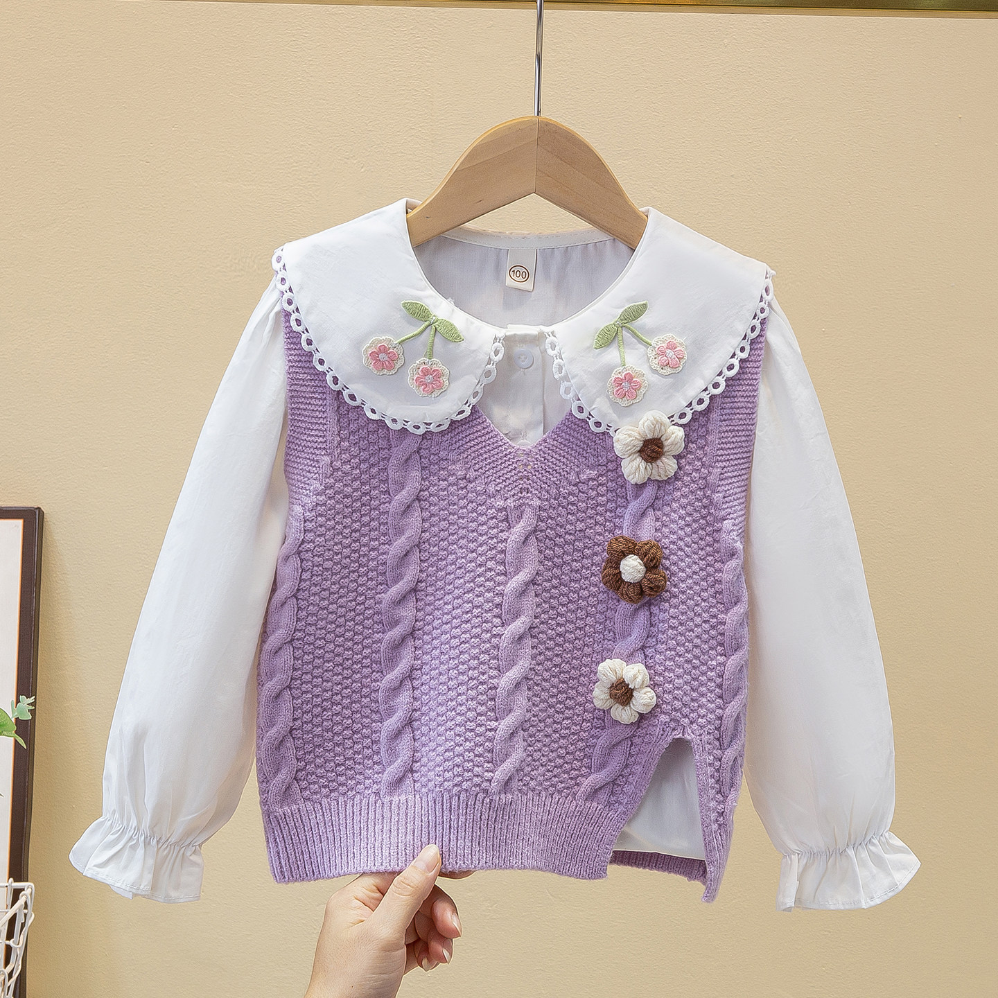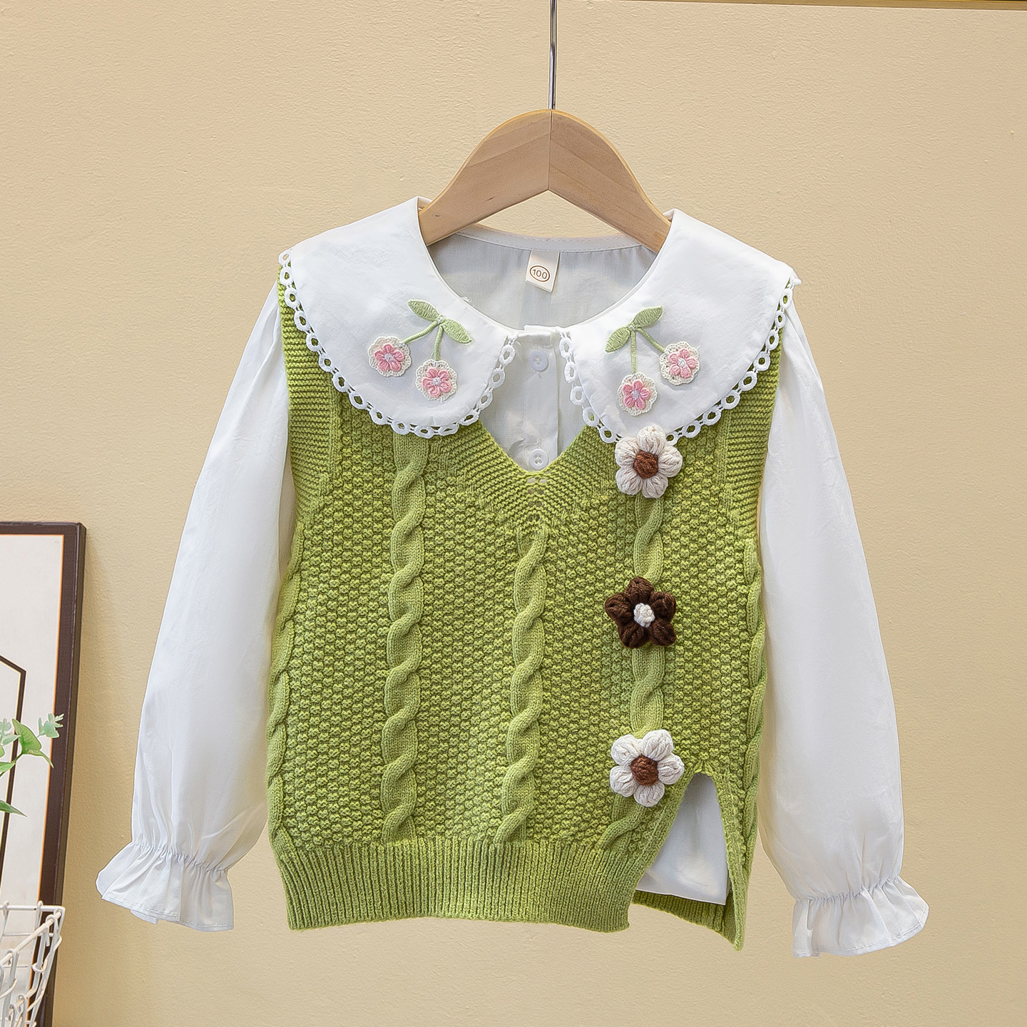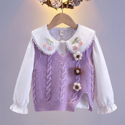 女童毛衣针织背心衬衫春秋新款儿童洋气马甲两件套装女孩纯棉长袖