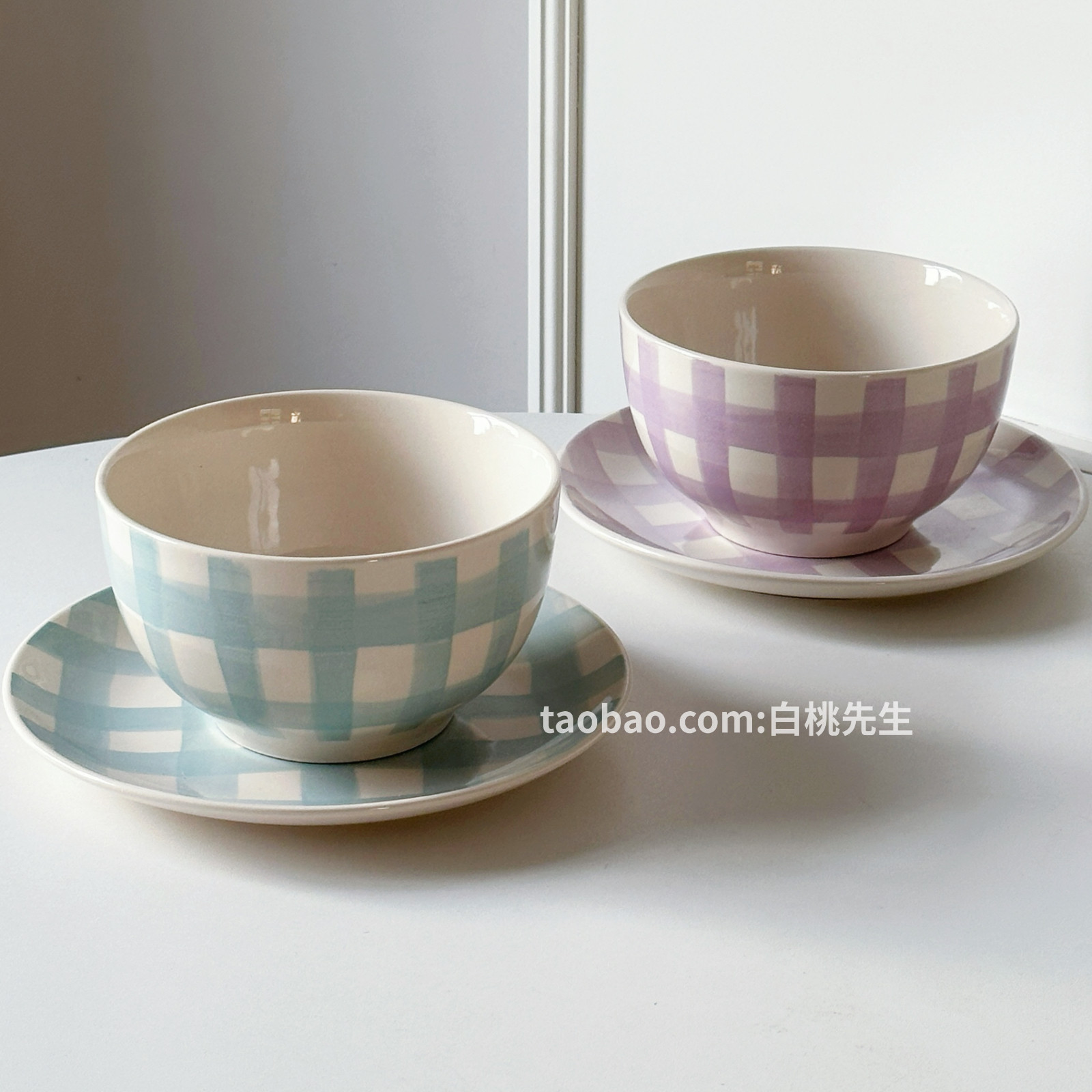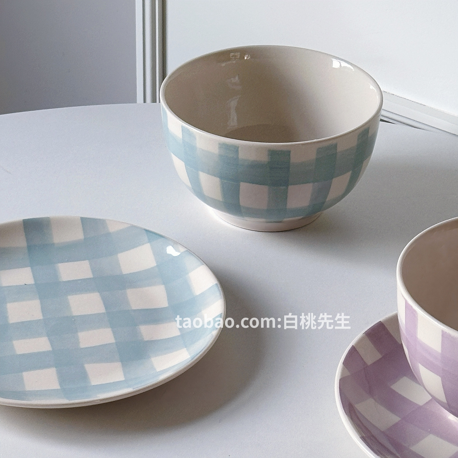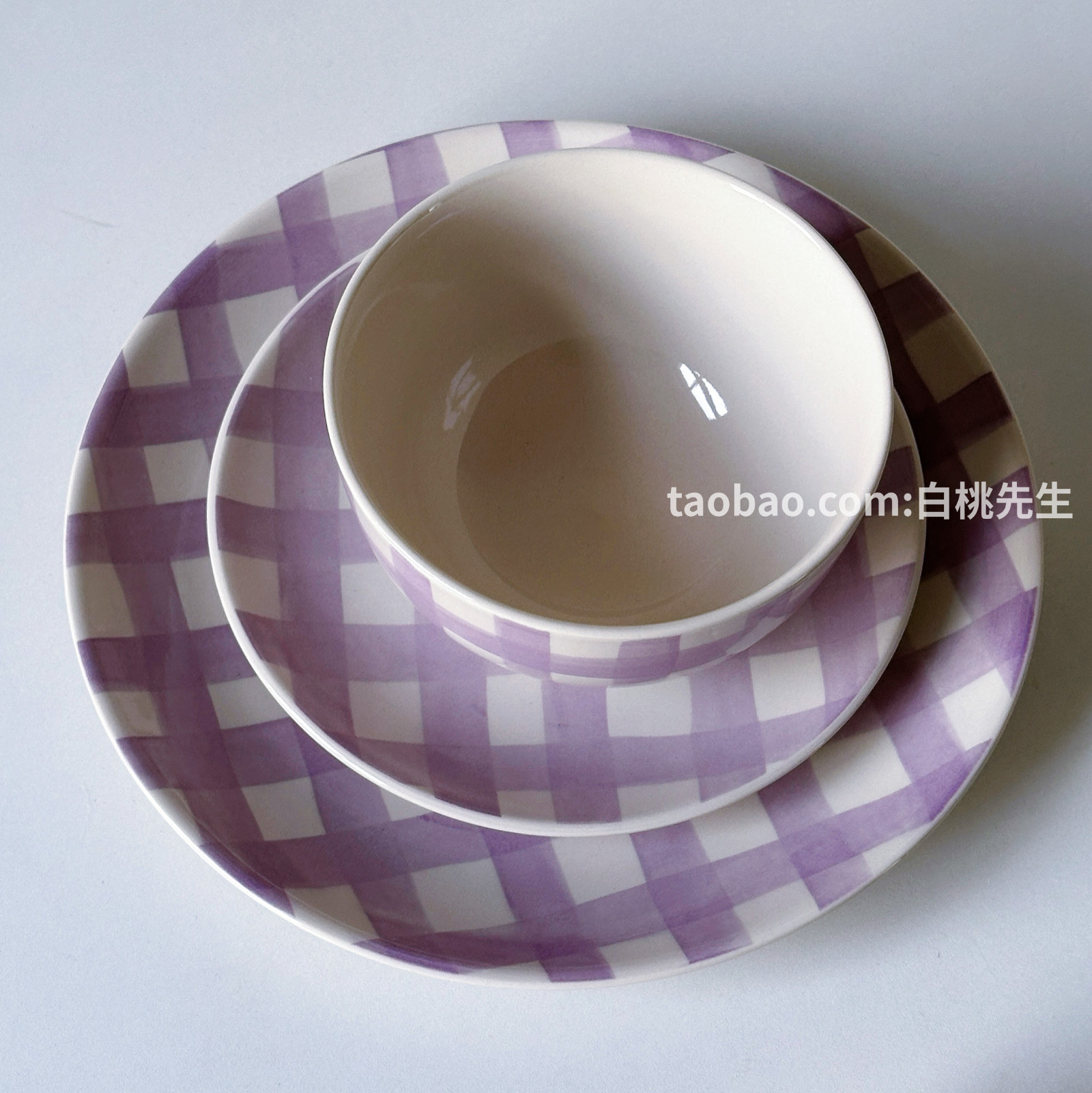 格子英式田园乡村ins陶瓷餐具简约盘子甜品盘子饭碗蓝色紫色好看