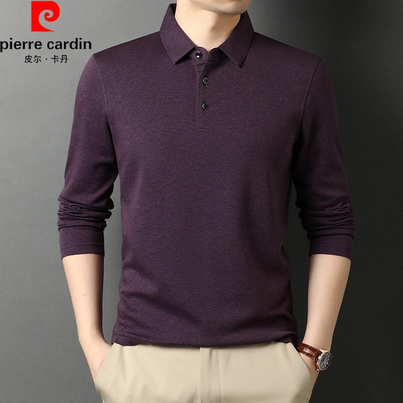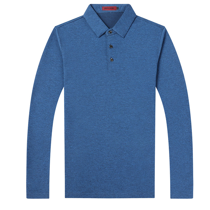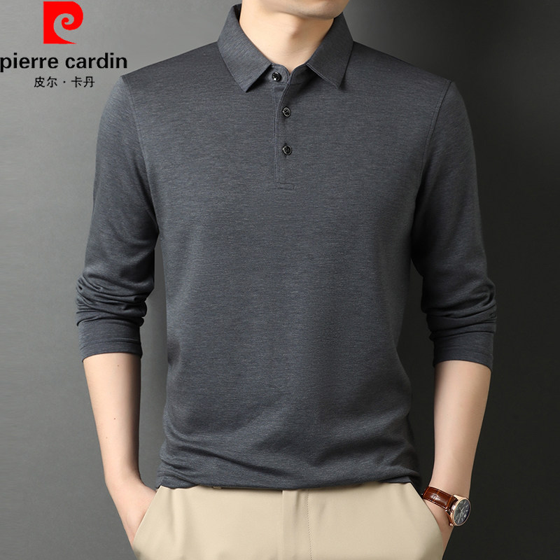 皮尔卡丹长袖T恤男纯色春秋款休闲polo衫带领翻领中年爸爸打底衫