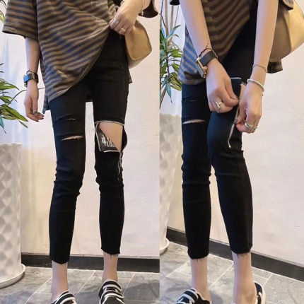 大码女装春秋2025新款高腰弹力破洞牛仔裤女胖mm显瘦烟管裤子女