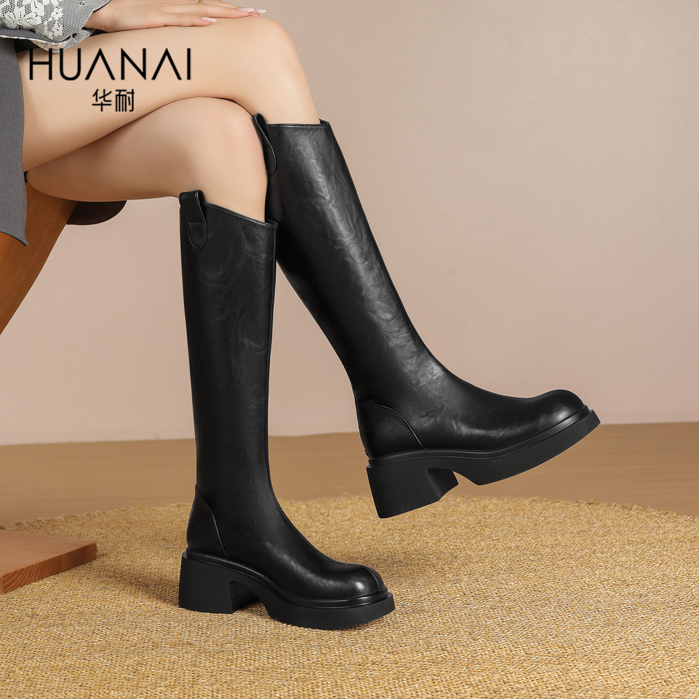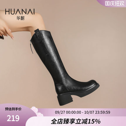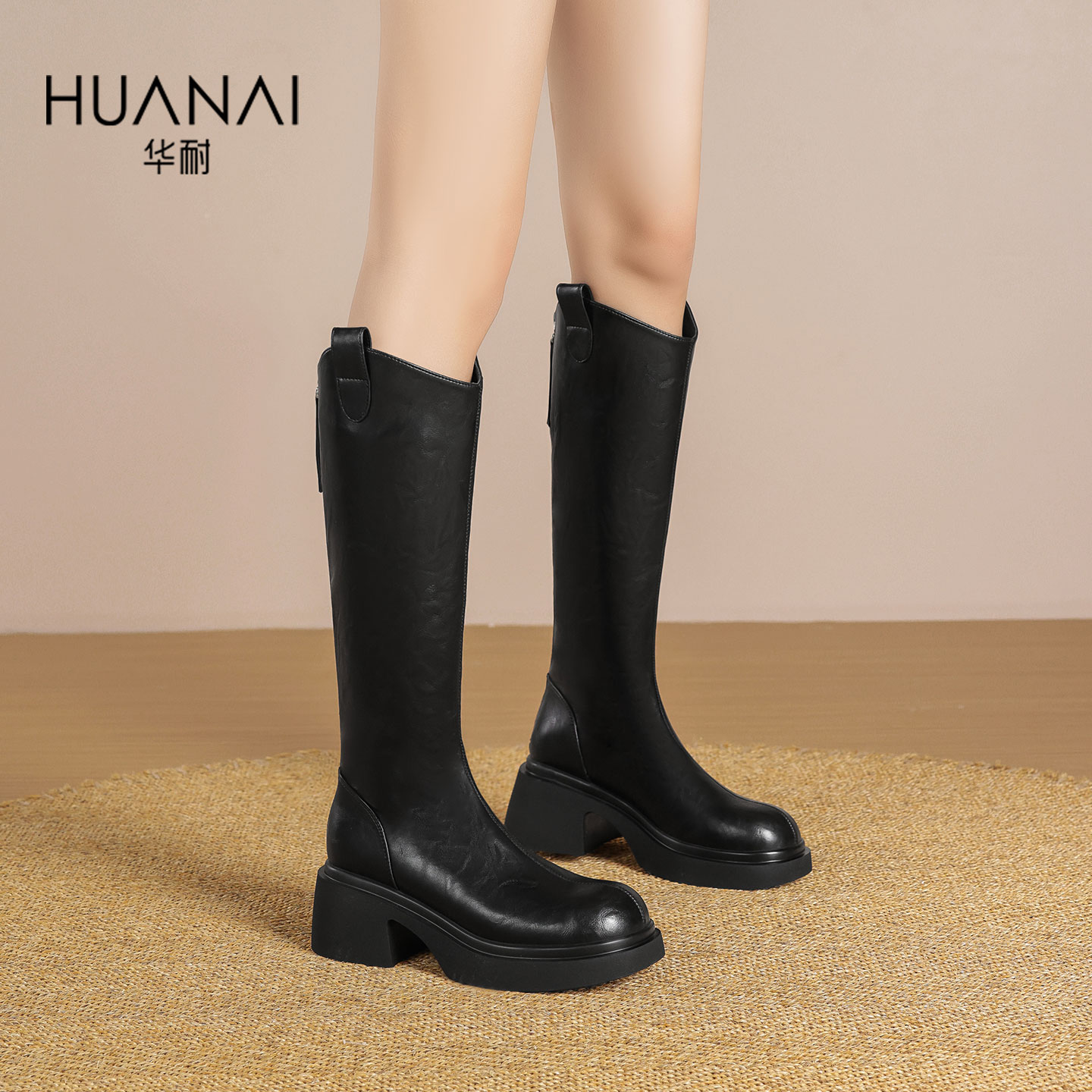 华耐长筒骑士靴女2025秋新款粗跟V口不过膝英伦风增高显瘦高筒靴