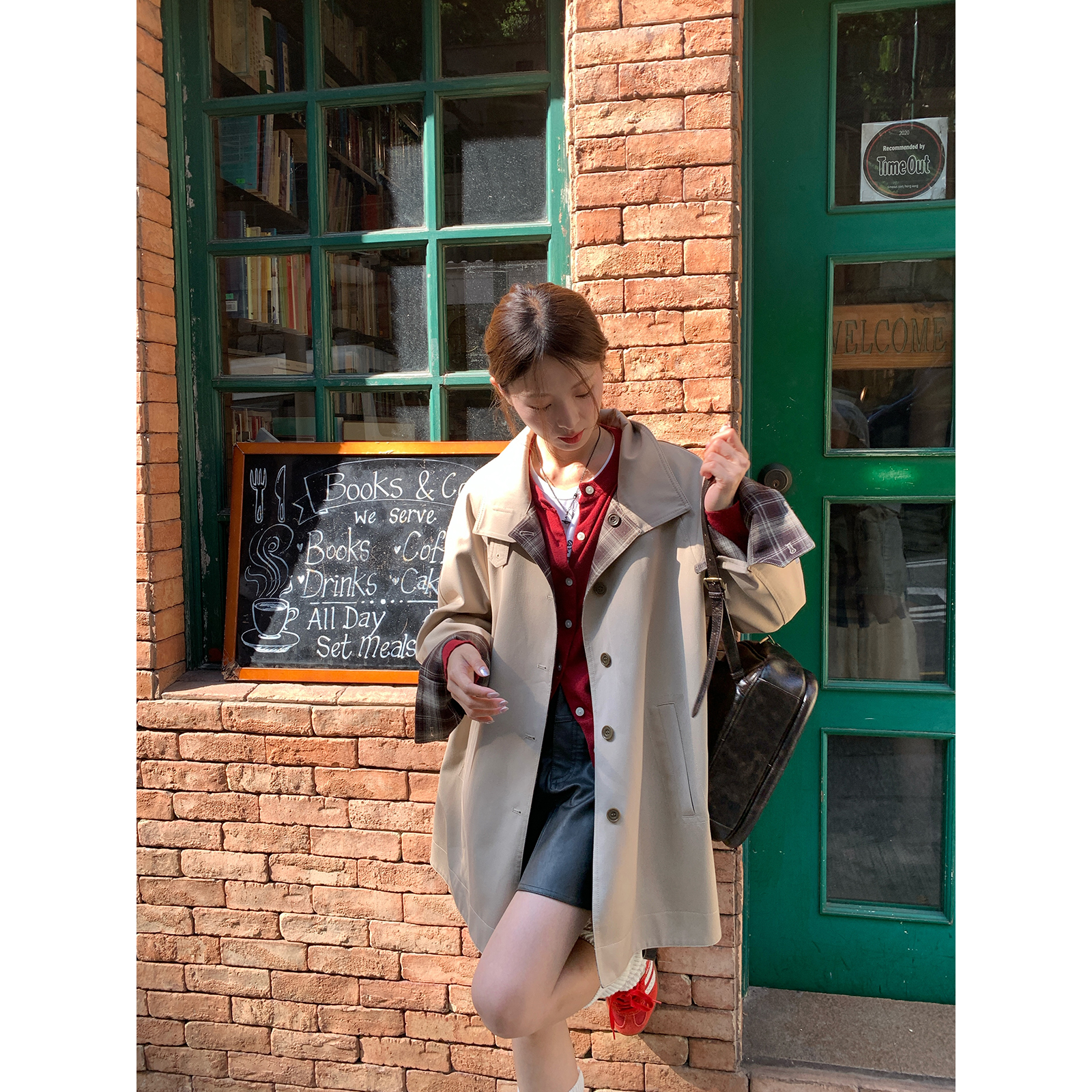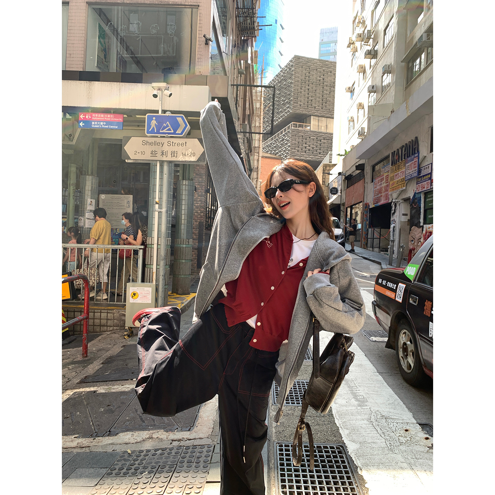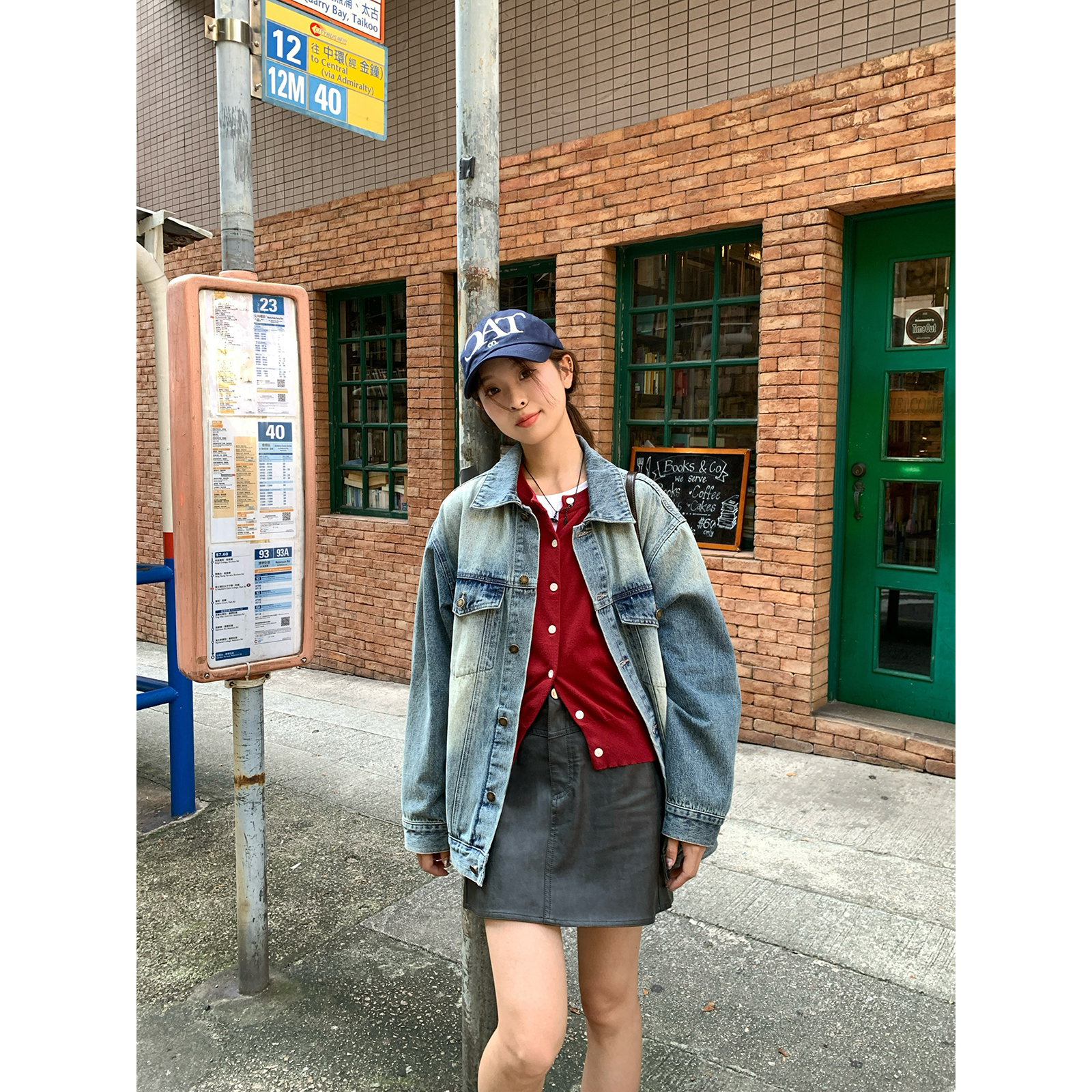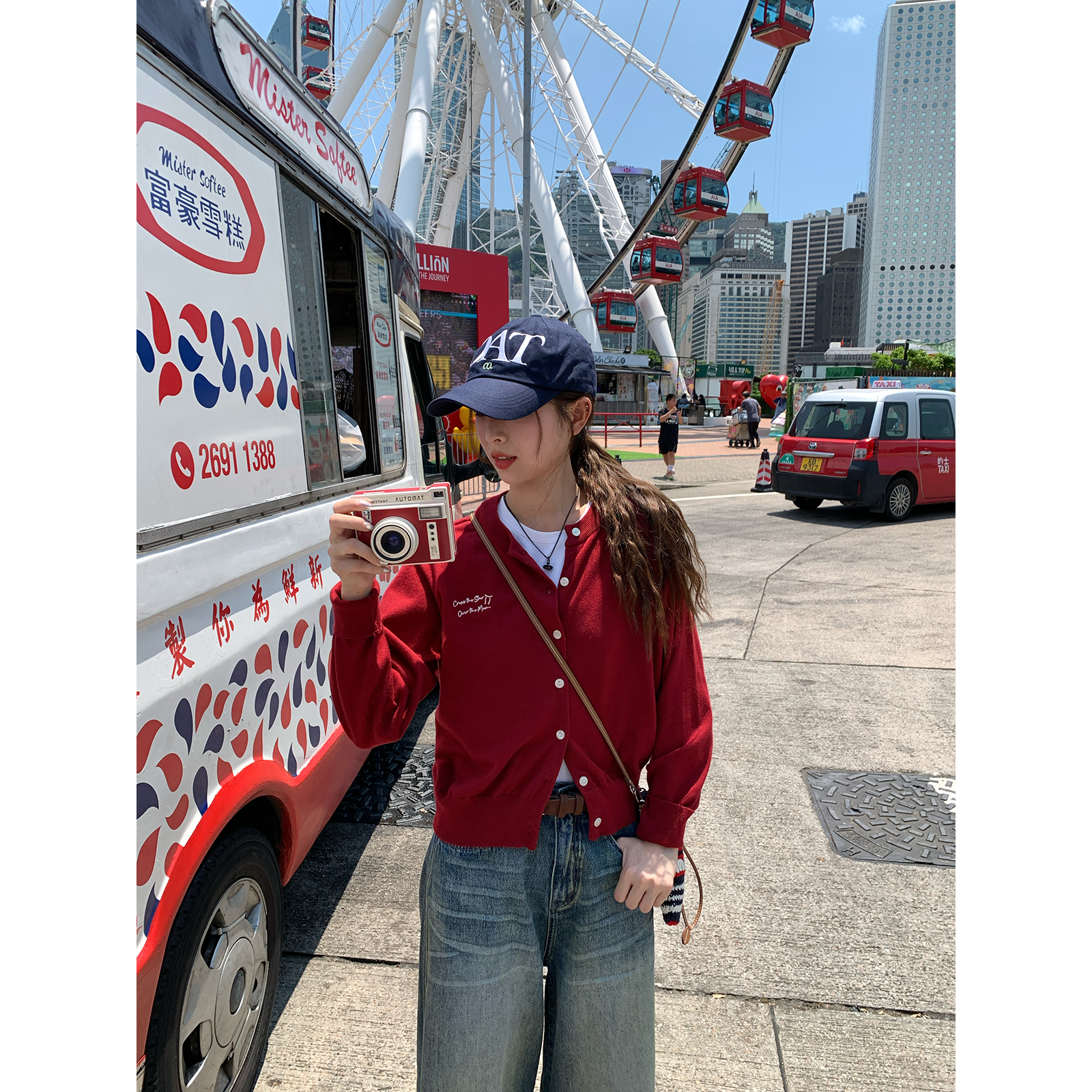 WHYSTUDIO_复古红色针织开衫短款毛衣女新款圆领字母宽松长袖外套