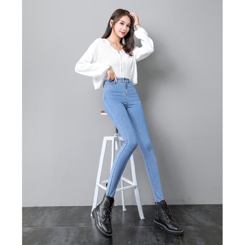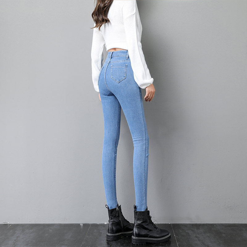 浅蓝色加绒牛仔裤女紧身小脚2025年夏秋新款弹力修身显瘦高腰长裤