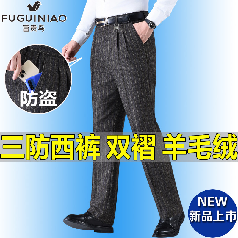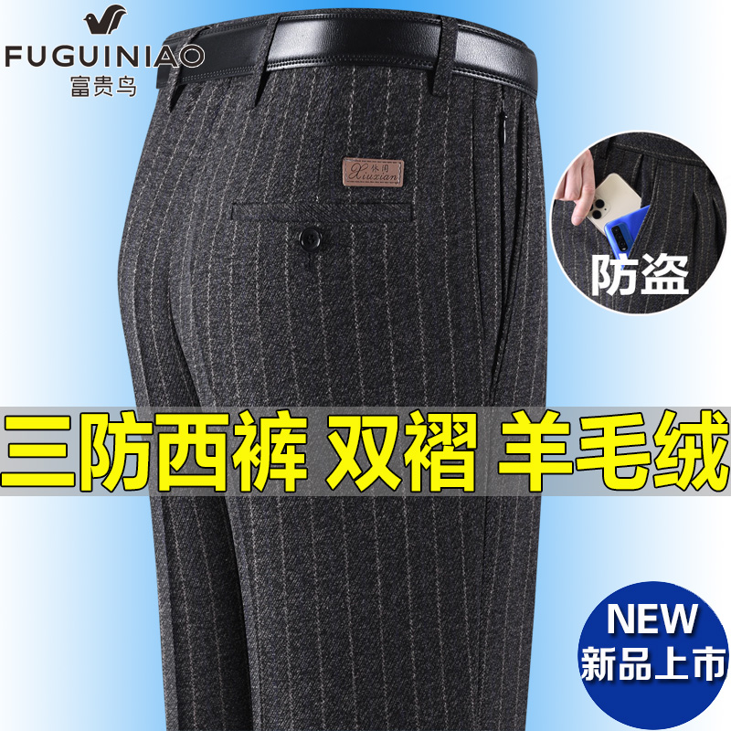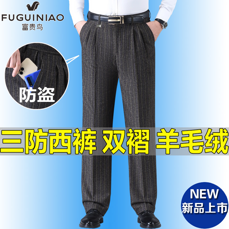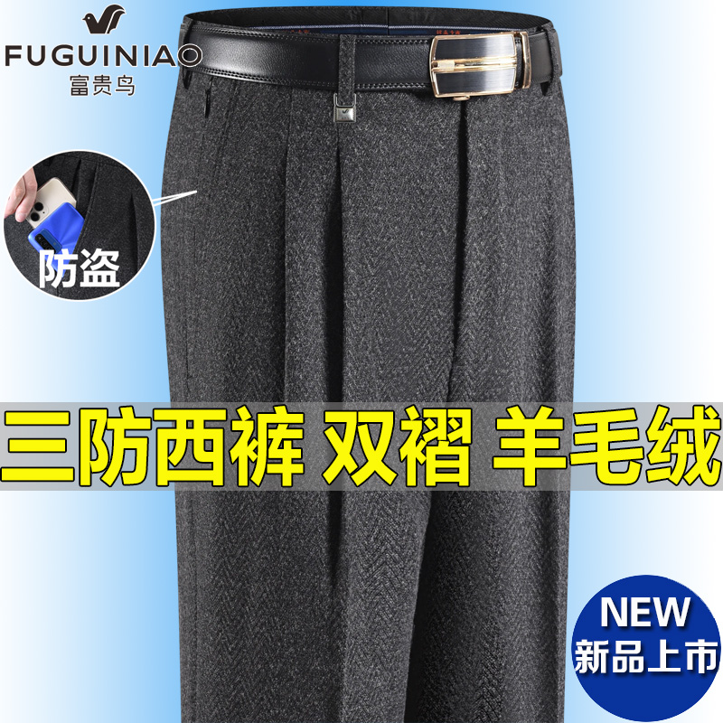 富贵鸟秋冬厚款羊毛绒三防西裤男双褶宽松中老年男裤高腰深档防盗