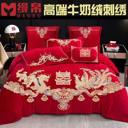 牛奶绒四件套结婚大红色冬季珊瑚绒婚庆刺绣喜庆加厚保暖宝宝绒