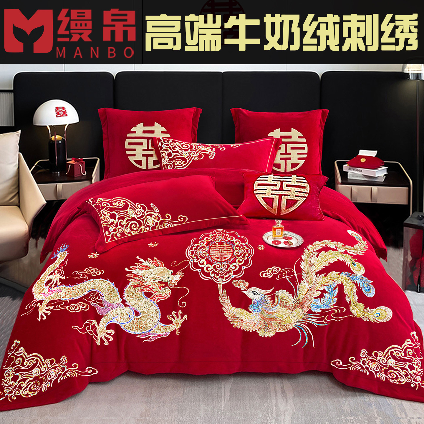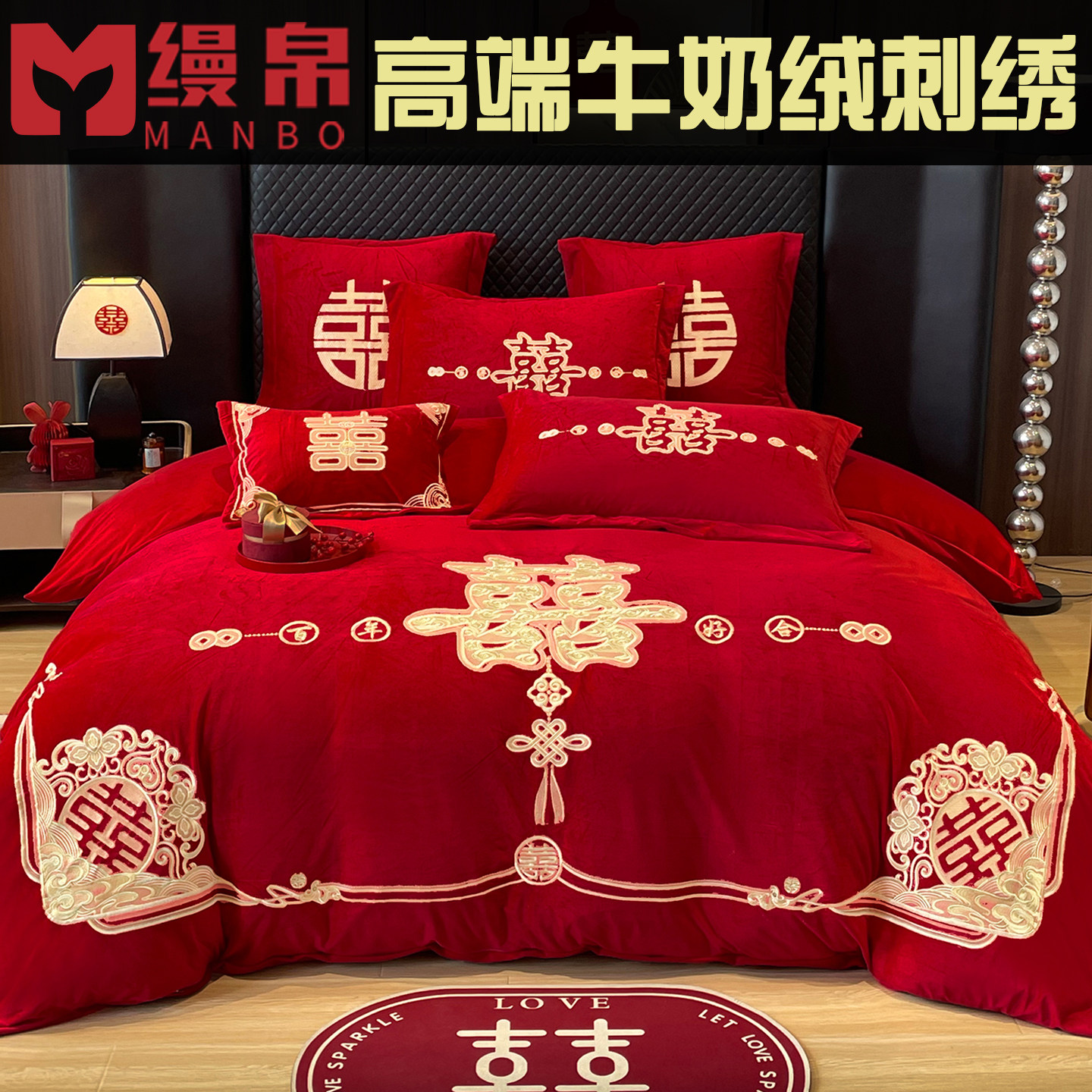 加厚牛奶绒大红色婚庆刺绣套件