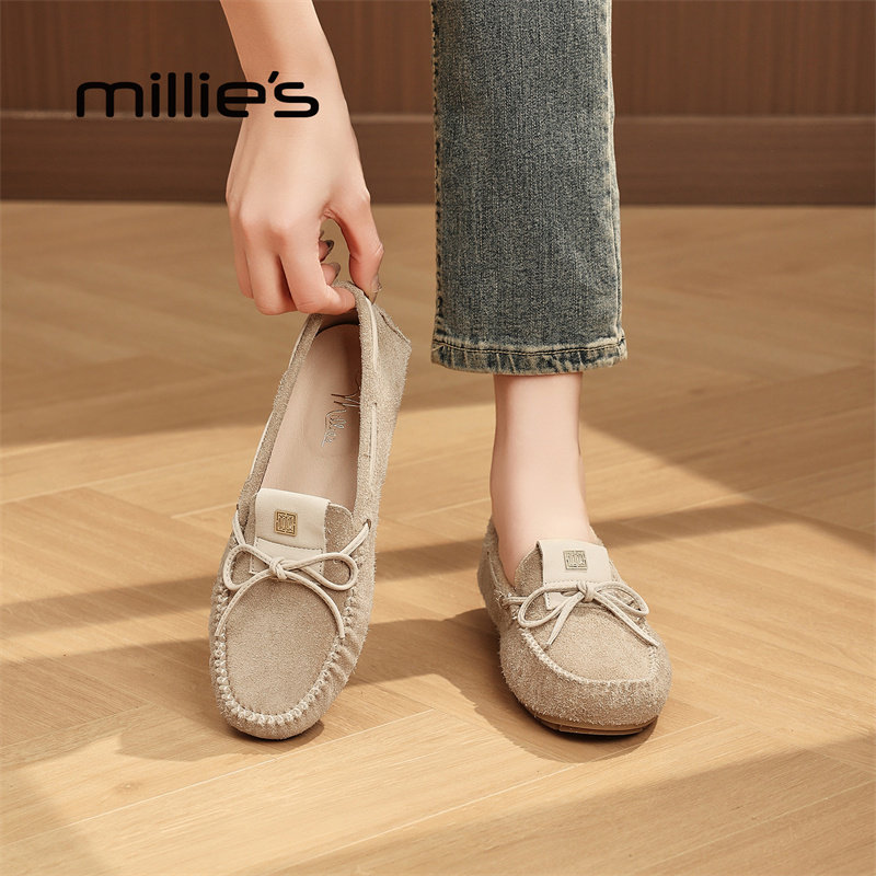 MILLIE'S/妙丽真皮浅口乐福鞋女老钱风通勤软底一脚蹬单鞋豆豆鞋
