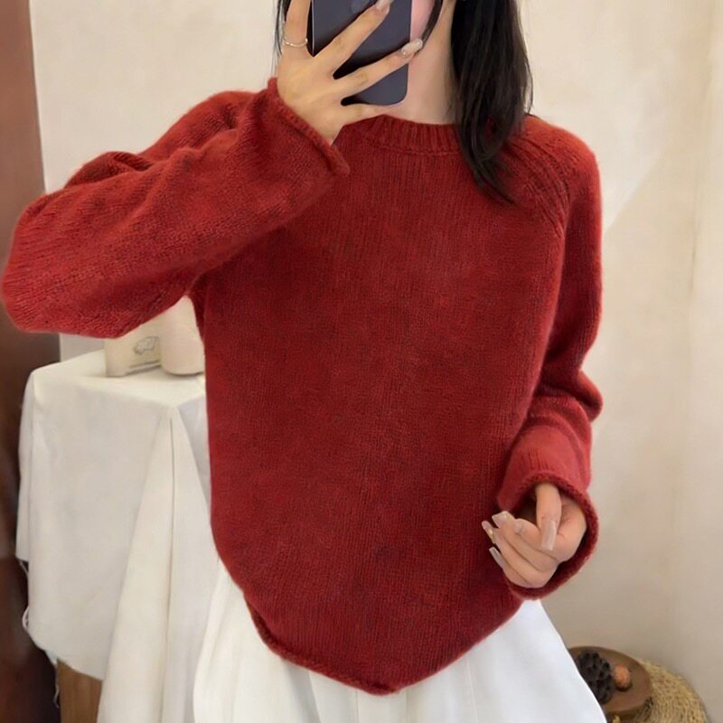 本命年红色100%纯羊毛衫女圆领针织毛衣宽松显瘦新年氛围感打底衫