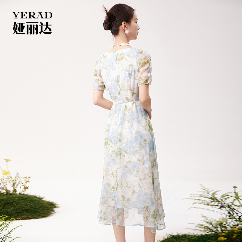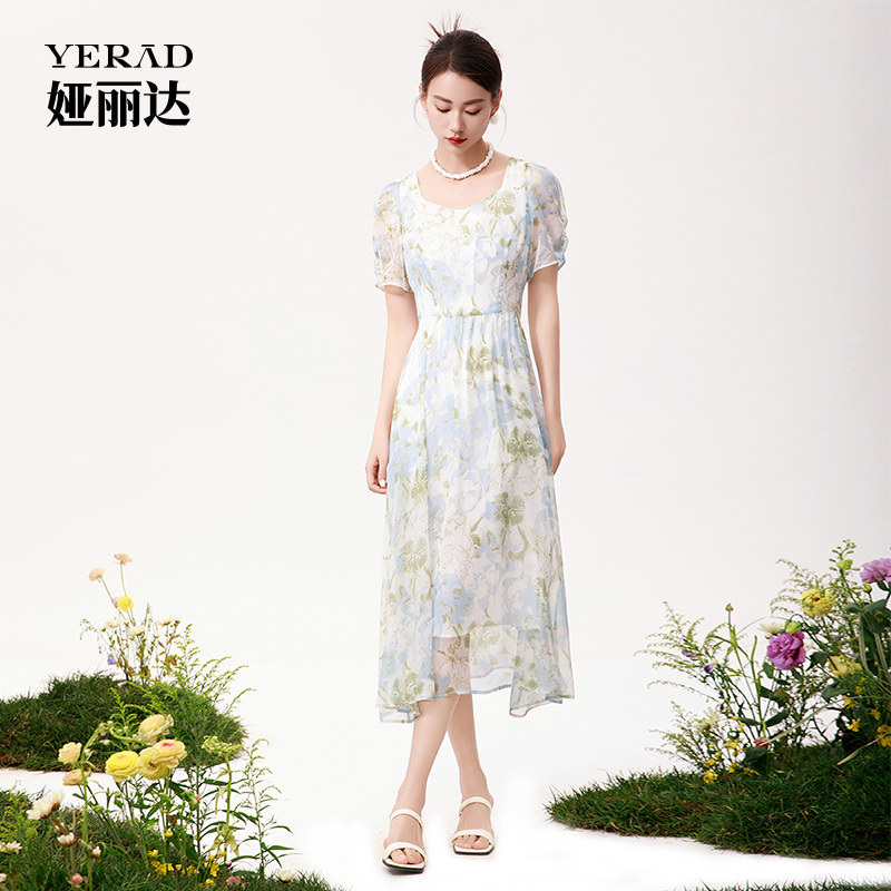 娅丽达商场同款方领雪纺碎花连衣裙女夏季新款显瘦裙子优雅茶歇裙