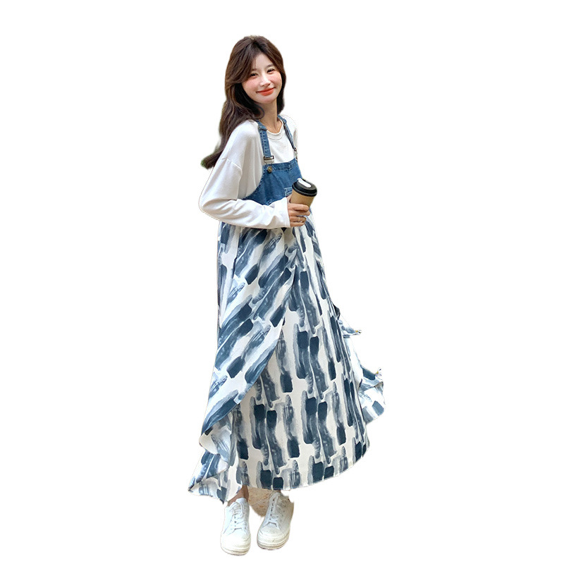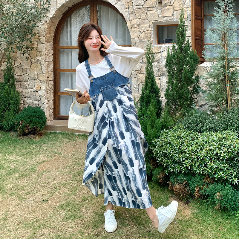 官网女装夏易菲蓝色牛仔拼接背带连衣裙女春季2025新款小众设计不
