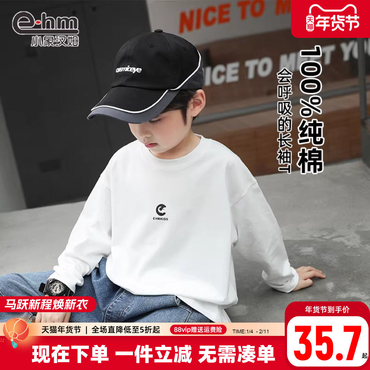 小象汉姆童装男童长袖t恤纯棉儿童白色打底衫内搭2026春装新款潮