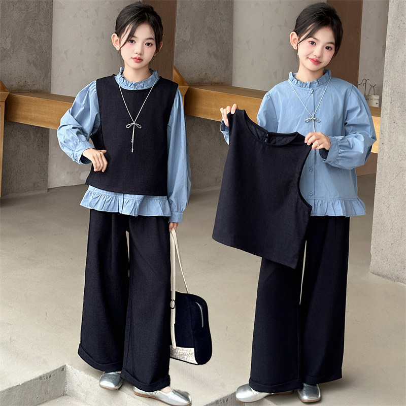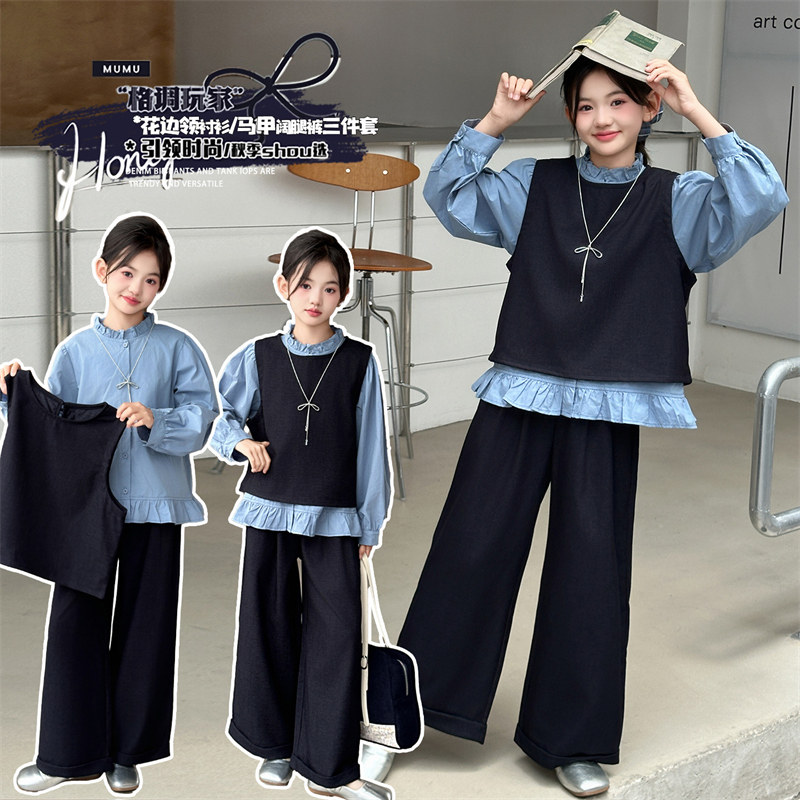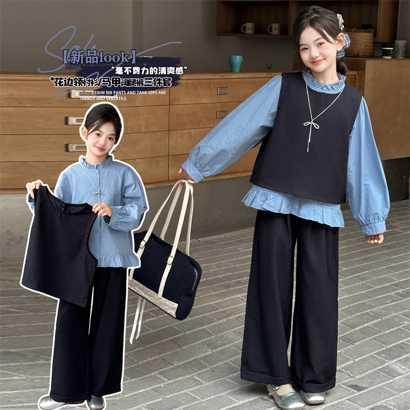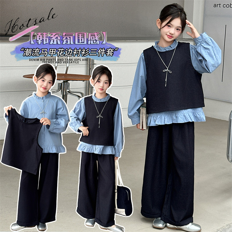 女童马甲套装春秋新款女孩学院风衬衫三件套韩版休闲童装衣服秋装