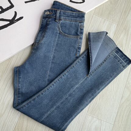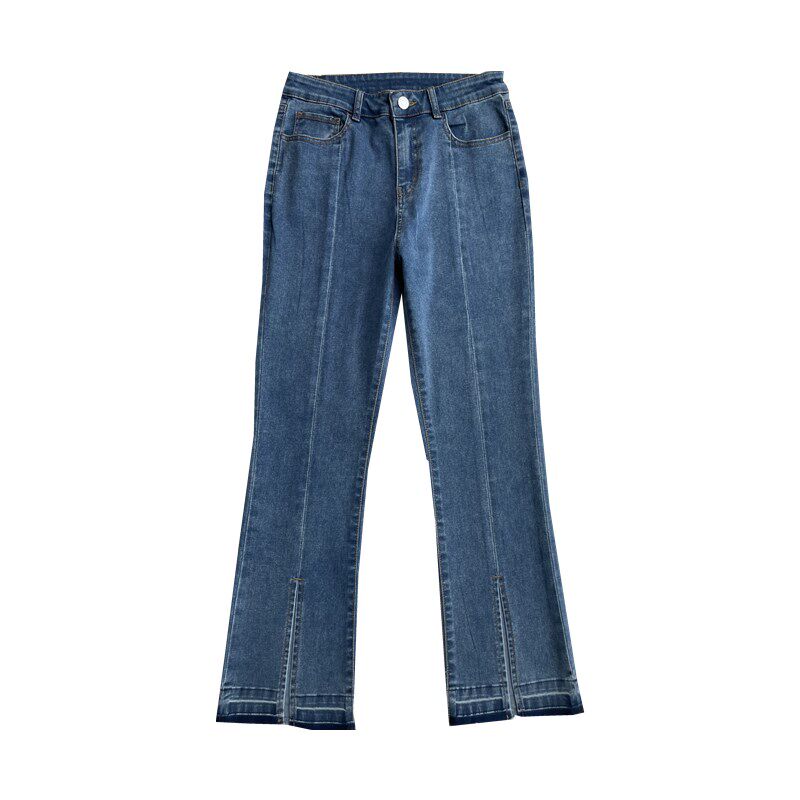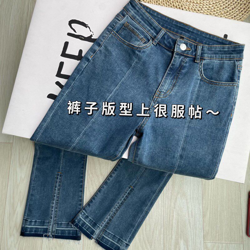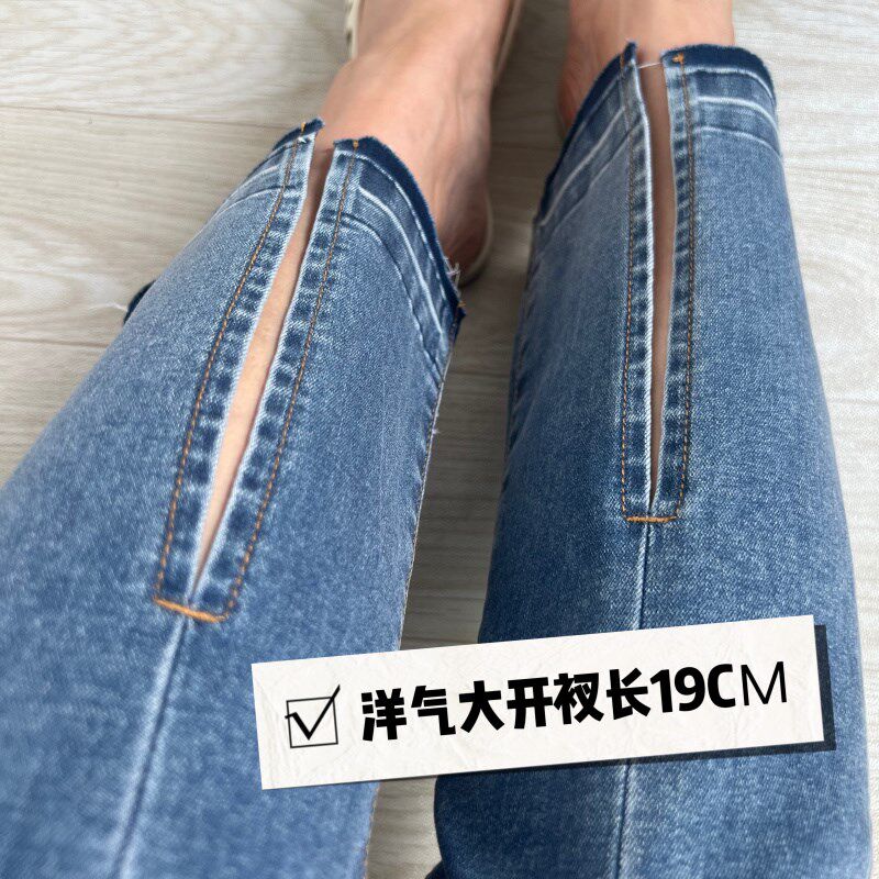 意式薄款开叉复古蓝弹力喇叭裤2023夏款 9分时髦高腰微喇牛仔裤