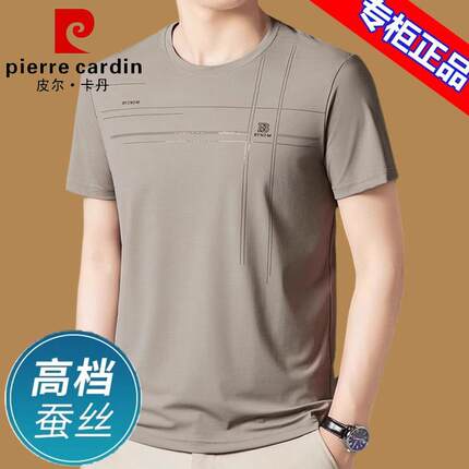 皮尔卡丹高端桑蚕丝短袖t恤男士2025新款圆领体恤衫夏季冰丝半袖T