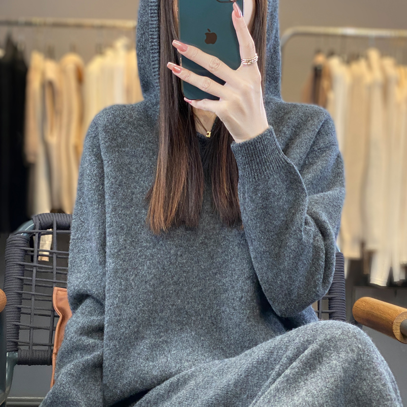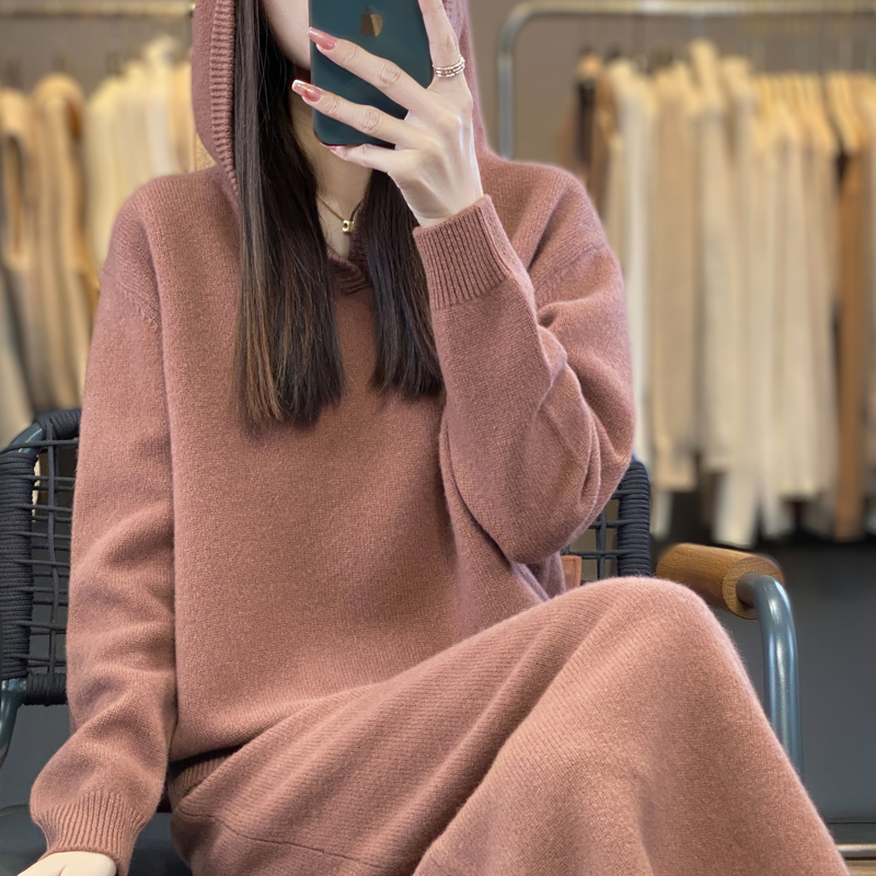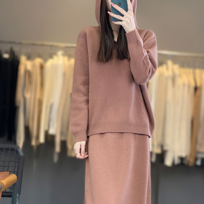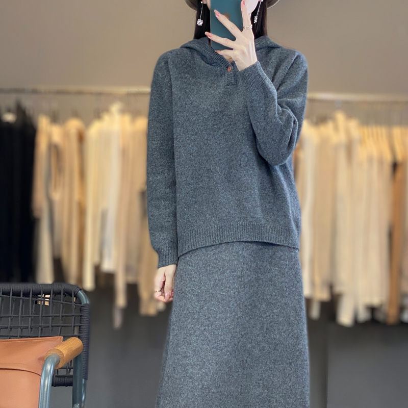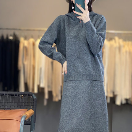 新款纯羊毛套装连帽毛衣针织宽松休闲上衣时尚两件套秋冬半身裙女