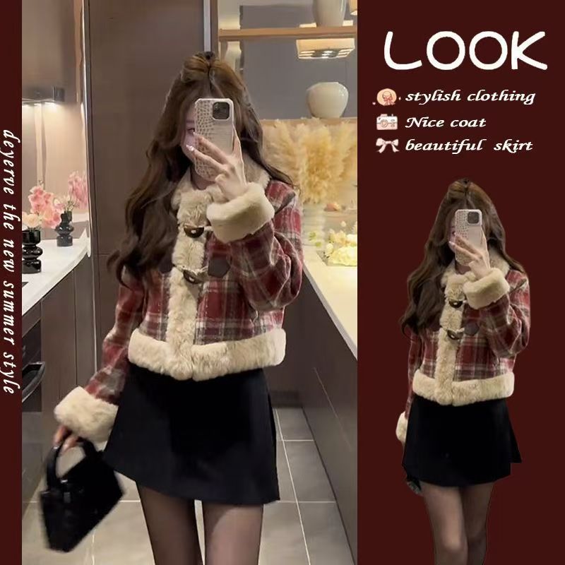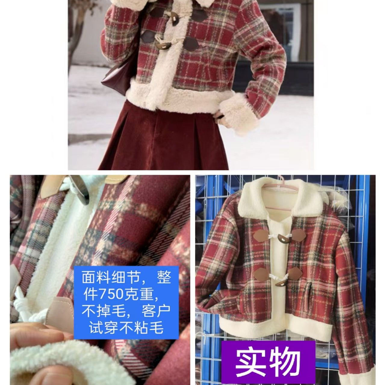 2025秋冬新款圣诞小香风高级感格子保暖娃娃领女外套百搭棉服上衣
