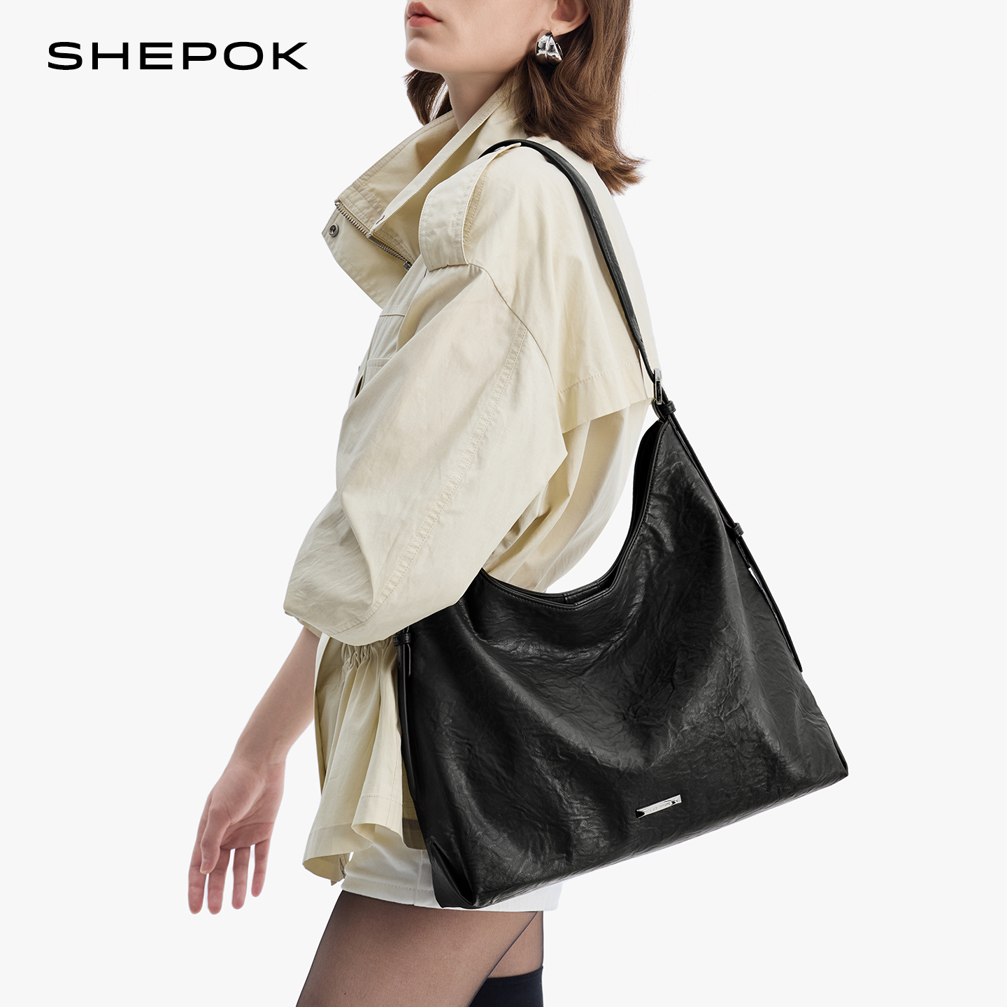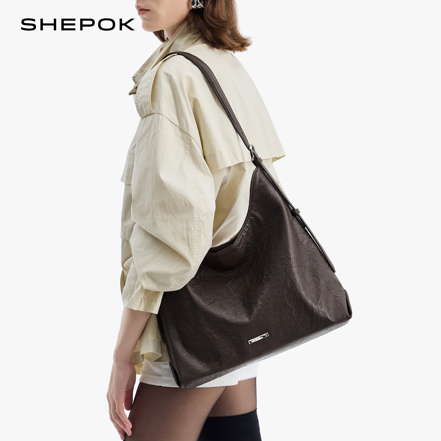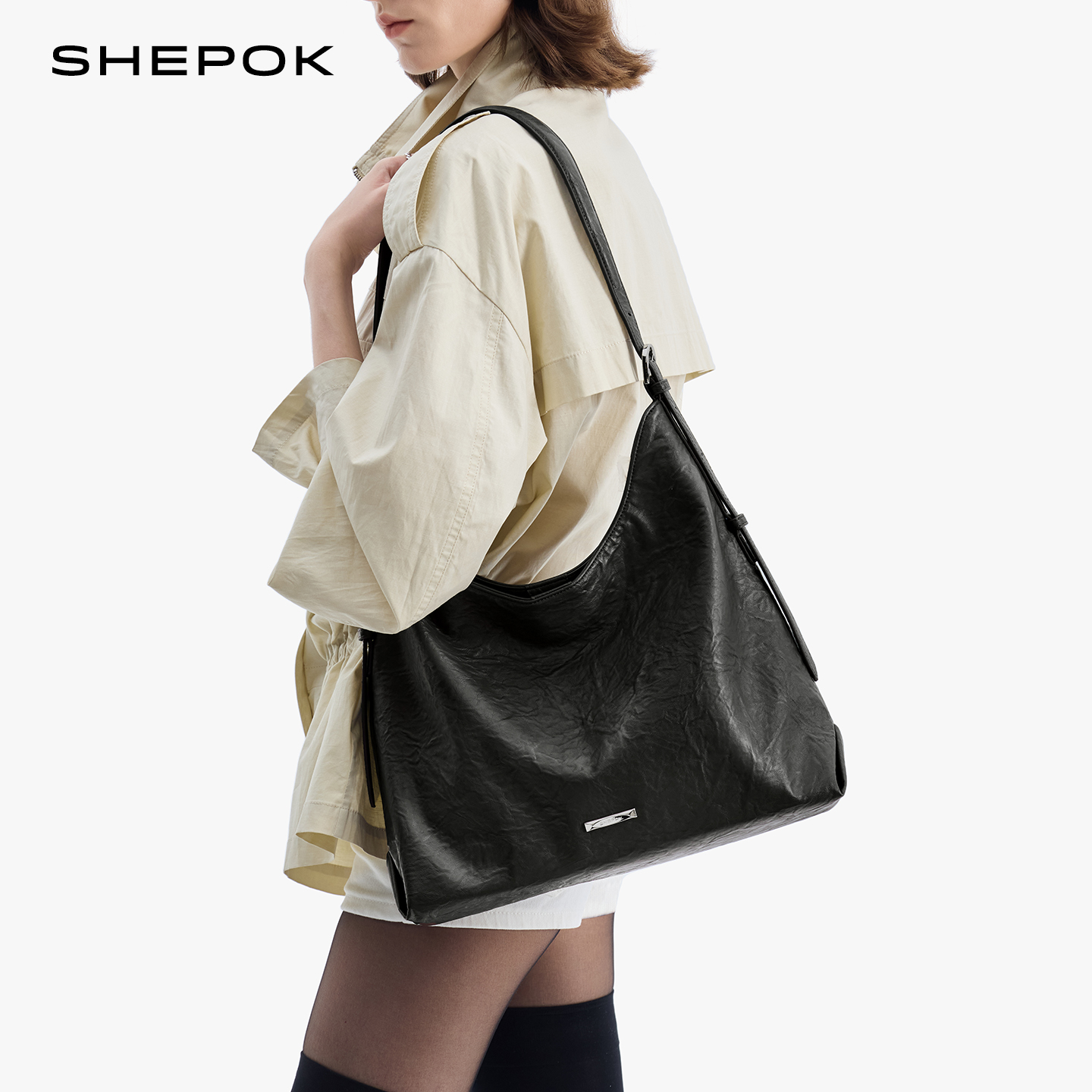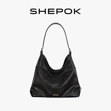 SHEPOK真皮女包2025新款软皮通勤高级感大容量牛皮单肩斜挎托特包