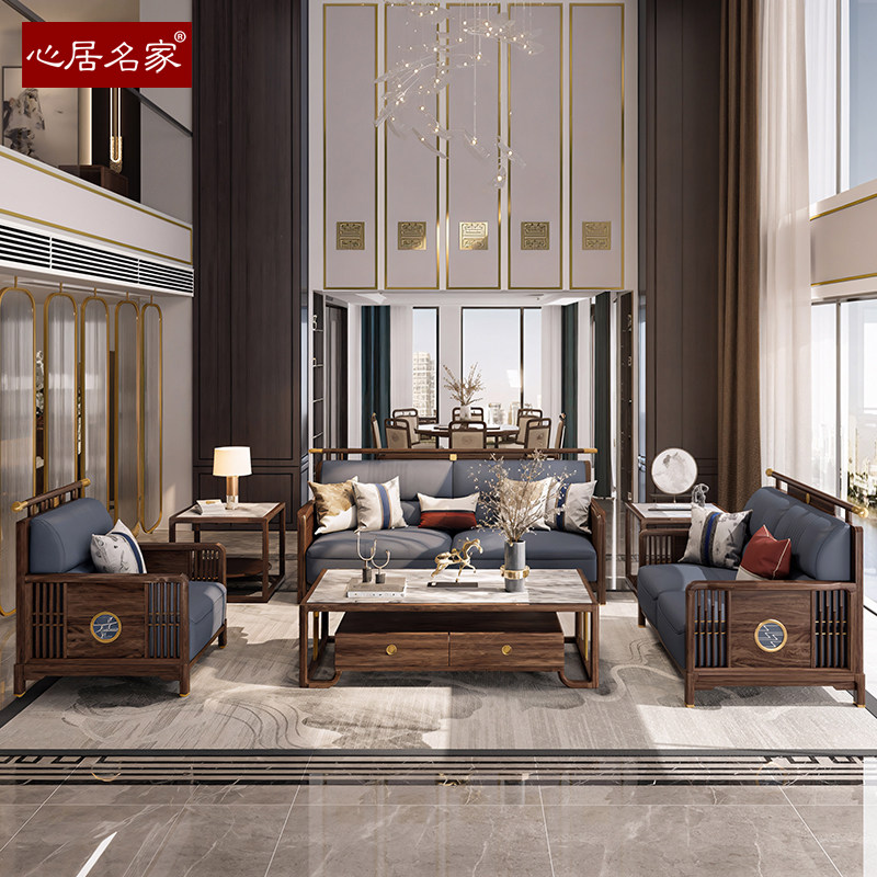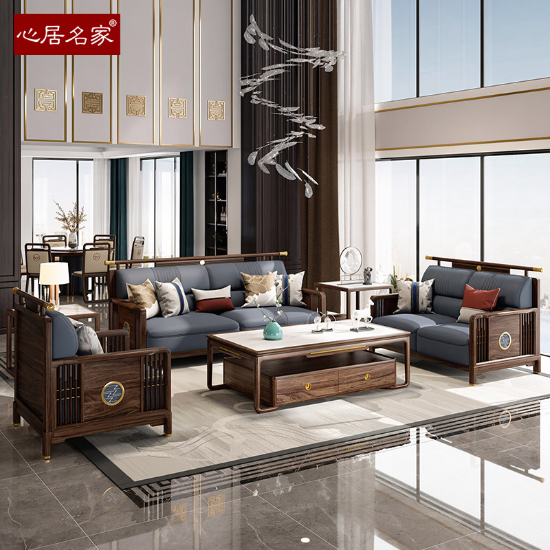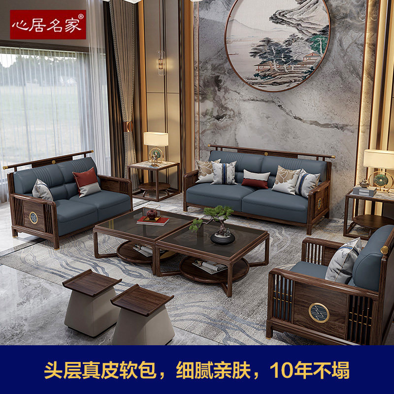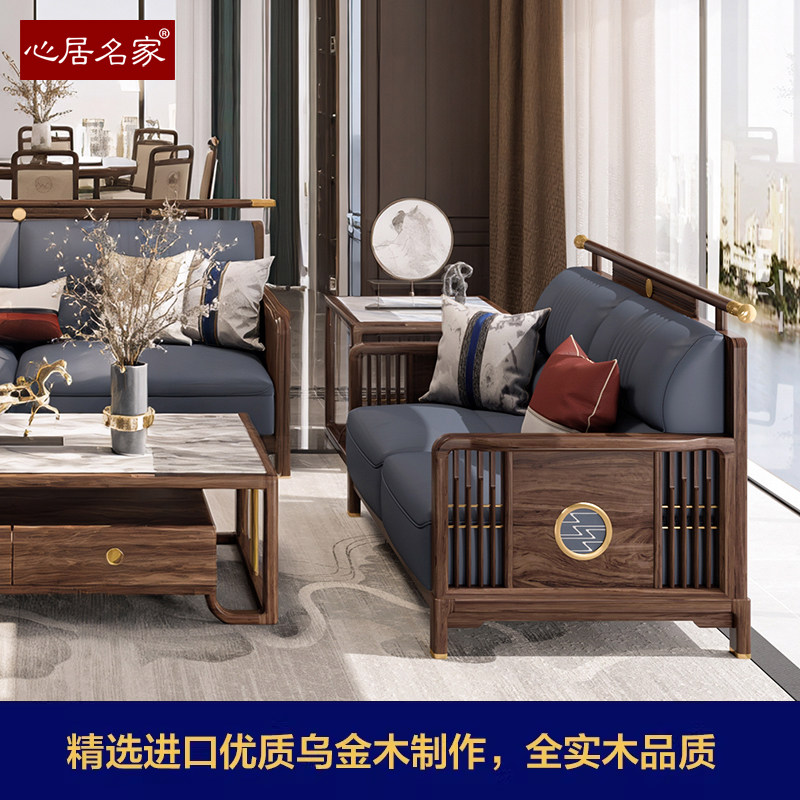 心居名家 新中式实木沙发组合进口乌金木头层真皮时尚轻奢官帽款