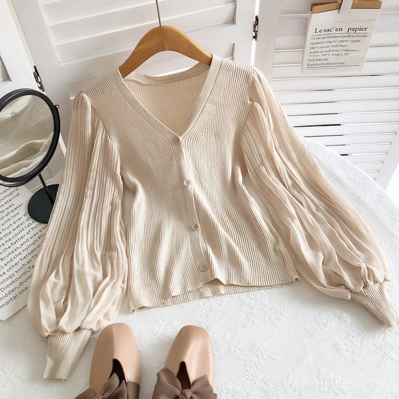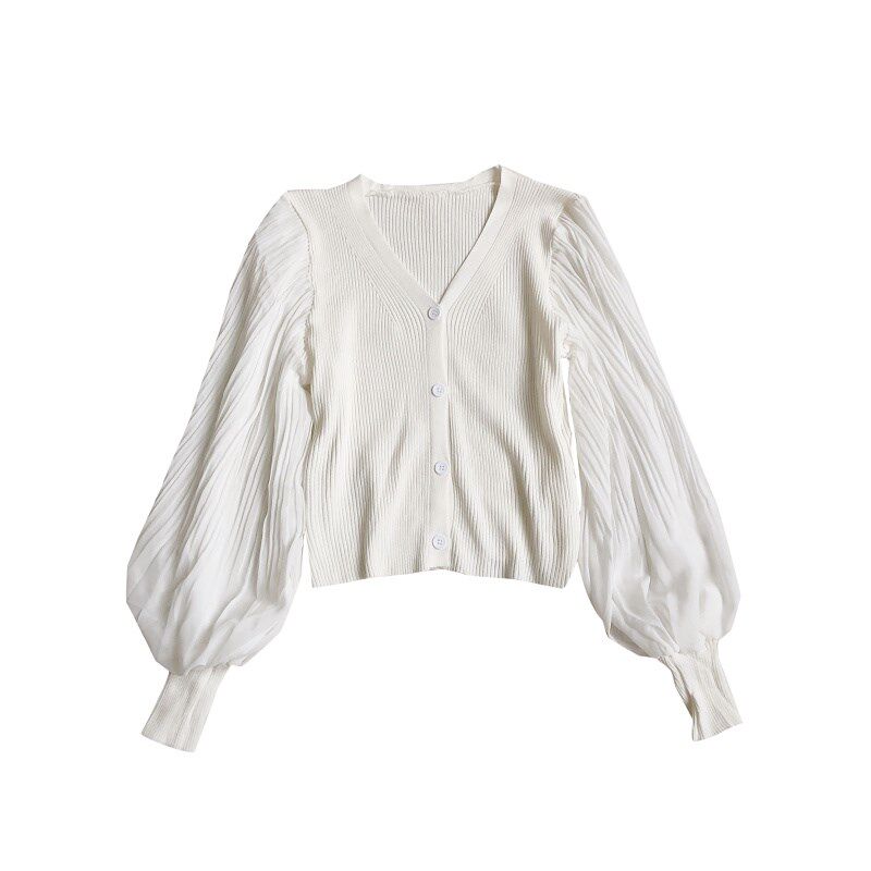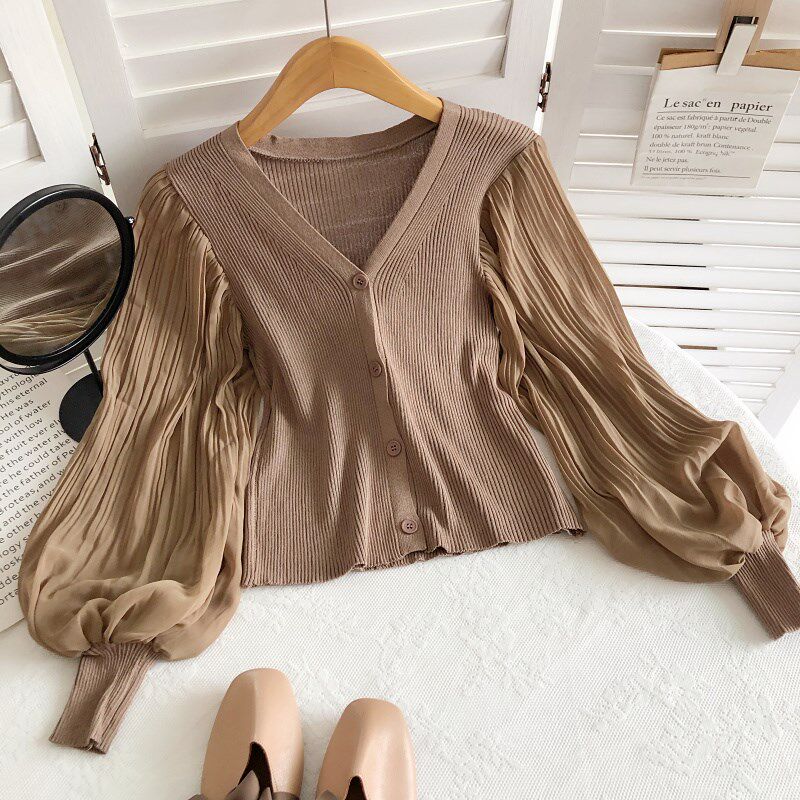雪纺拼接泡泡长袖单排扣V领针织衫2021秋冬新款修身显瘦打底衫女