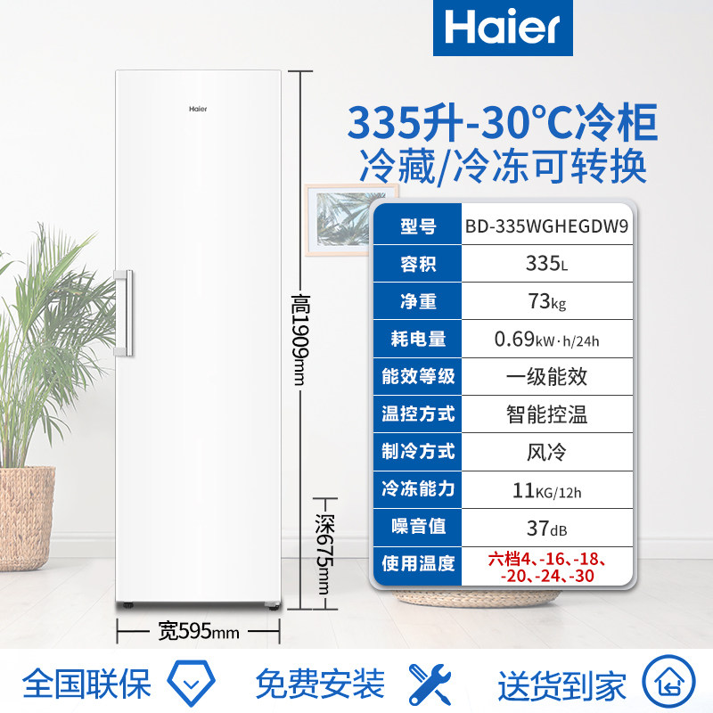 海尔立式冷冻柜风冷无霜家用双变频一级节能冷藏可拼接大容量335L