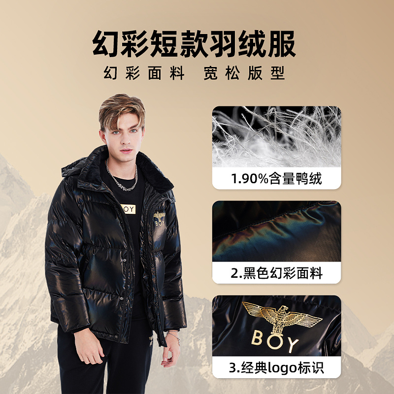 【黑胶唱片】BOYLONDON冬幻彩男女同款黑色短款保暖羽绒服N28915