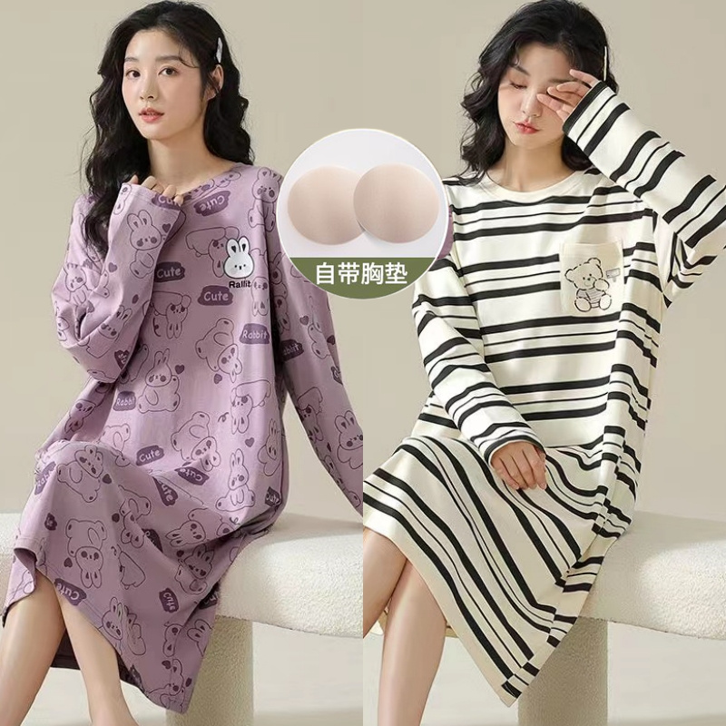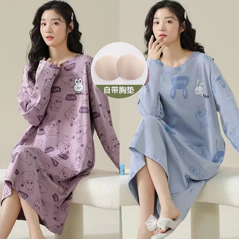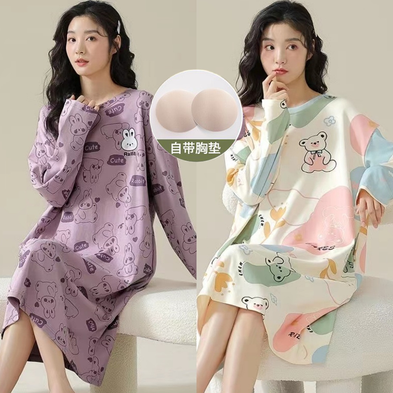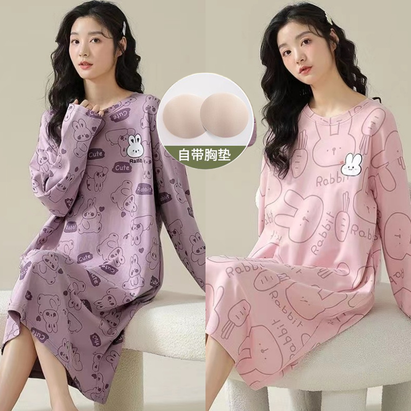 2025新款睡衣女士春秋季带胸垫一体睡裙纯棉长袖大码连衣裙家居服