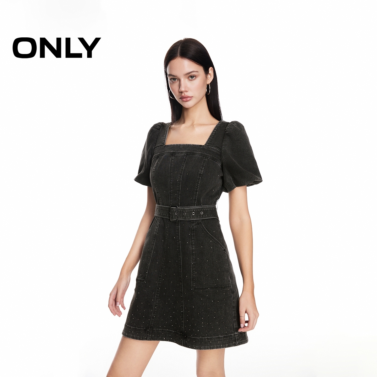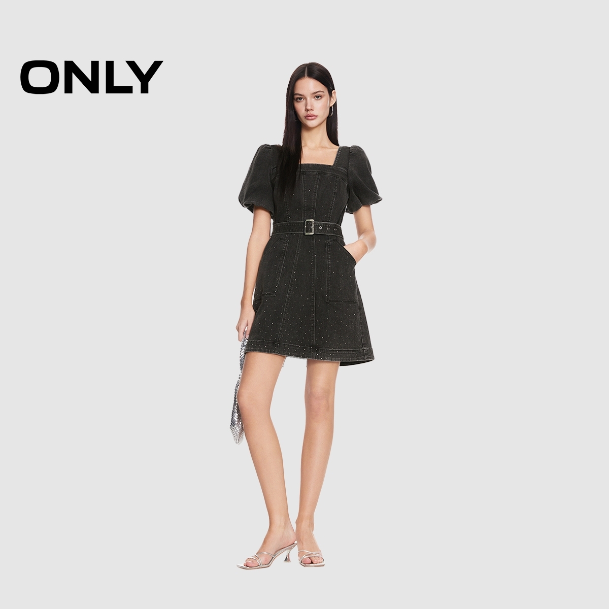 ONLY2025秋季新款复古莱卡泡泡袖烫钻装饰方领短裙牛仔连衣裙女