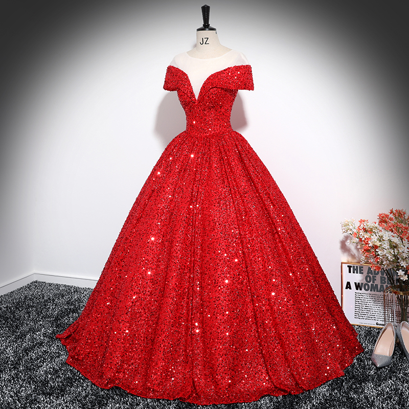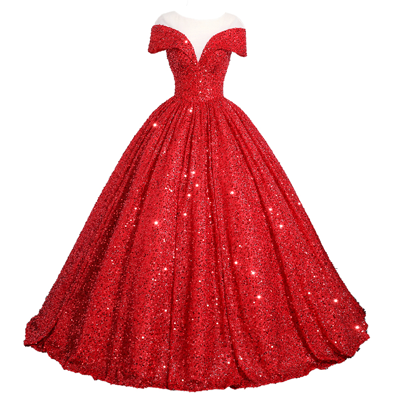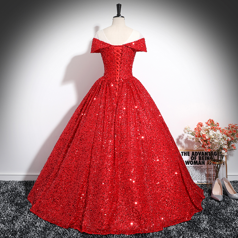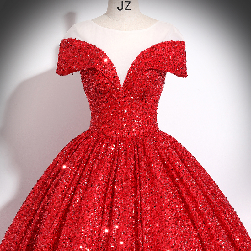 一字肩红色亮片晚礼服美声舞台独唱演出服年会艺考显瘦大摆蓬蓬裙